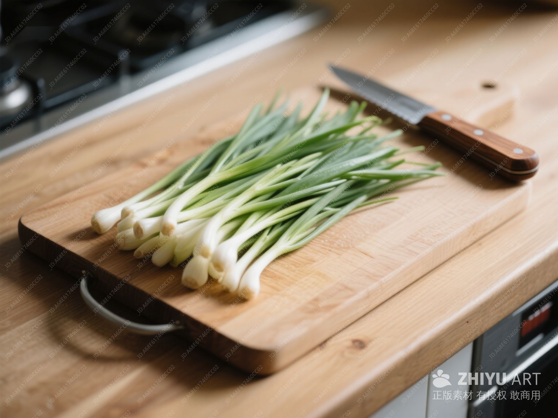 新鲜葱段置于竹篮,旁配木柄刀具 399