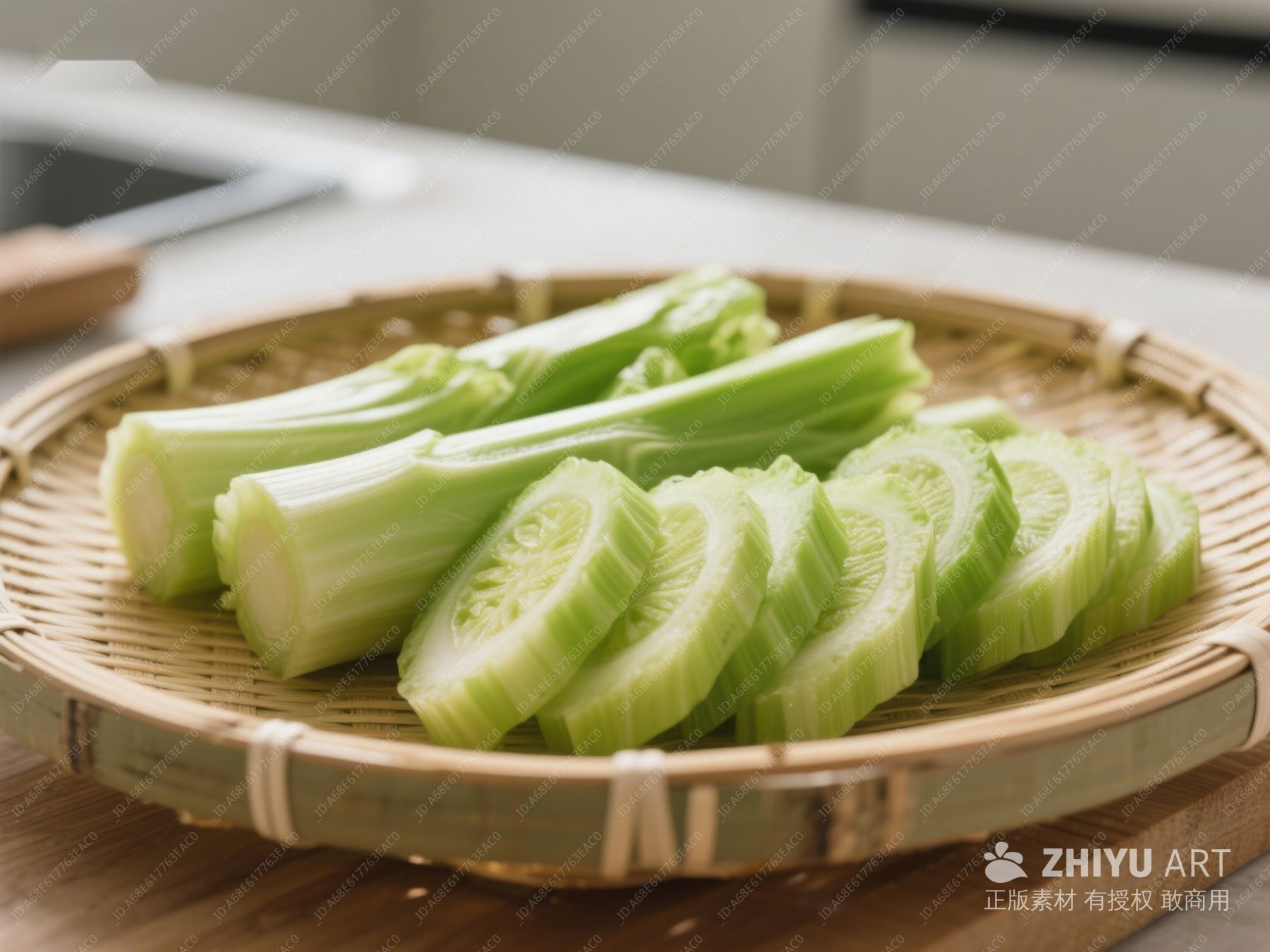 新鲜芹菜置于竹篮,配以木柄刀具 481