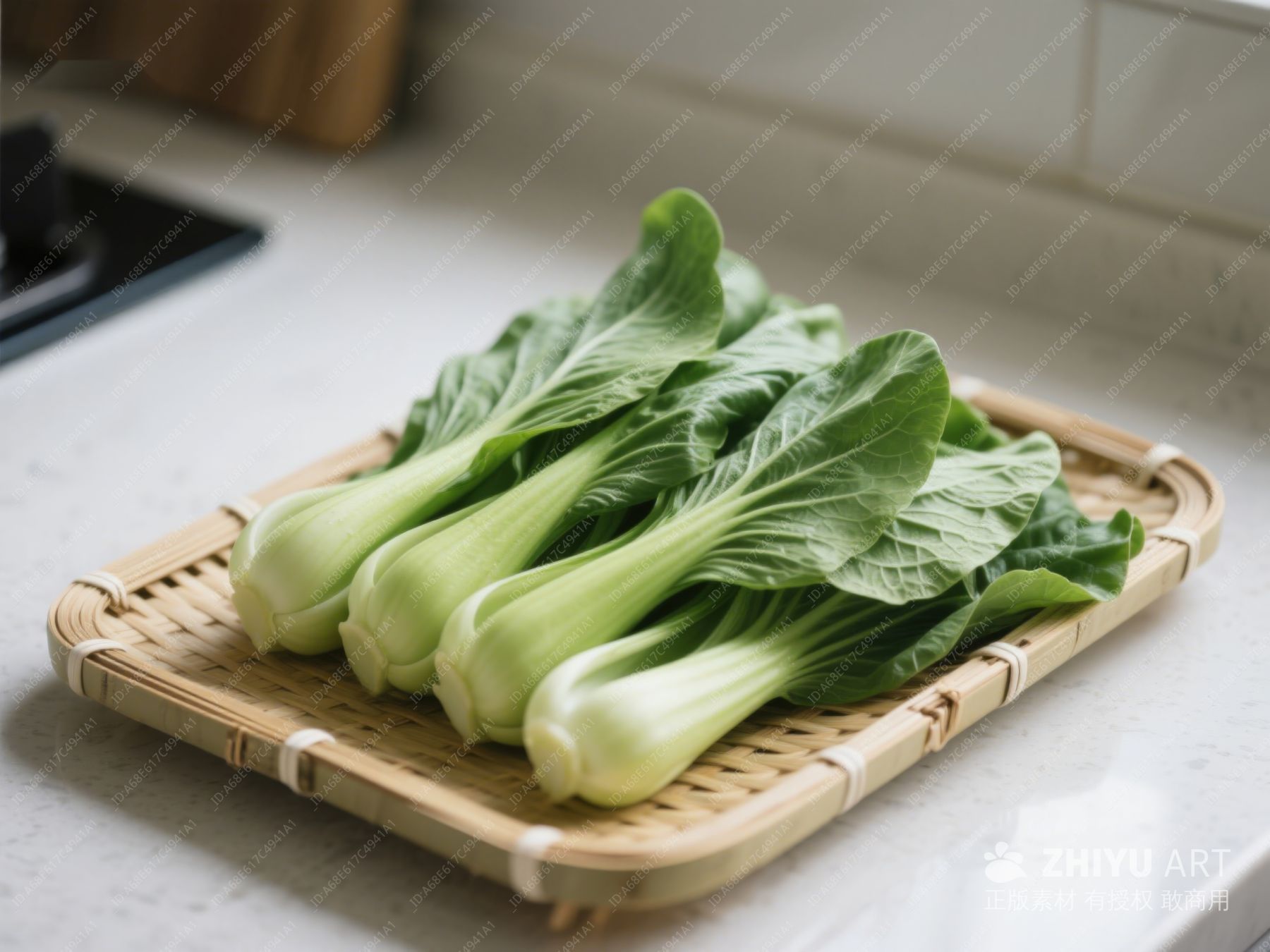 新鲜青菜置于竹篮,厨房砧板旁 494