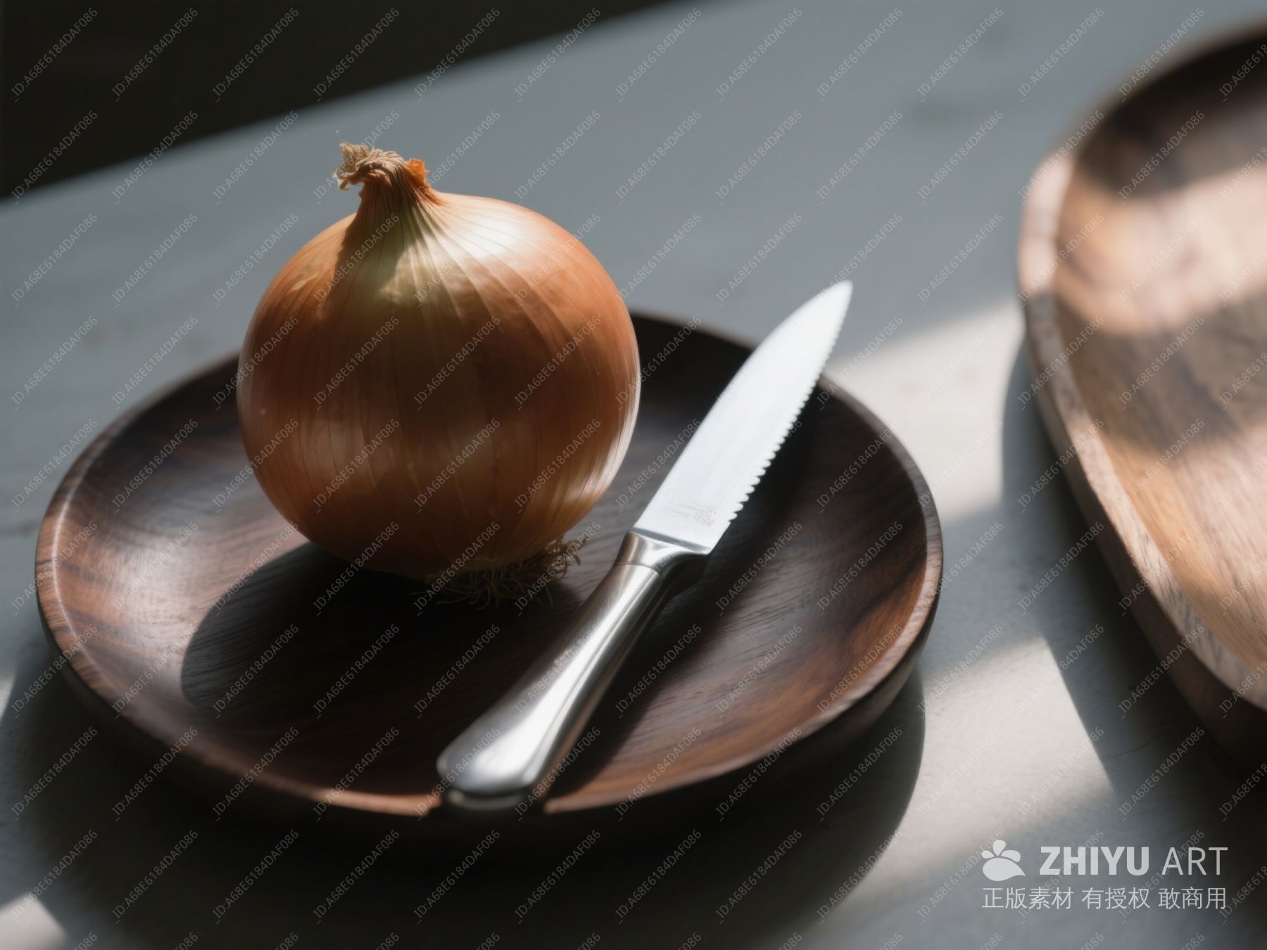 洋葱与刀置于木质盘中 581
