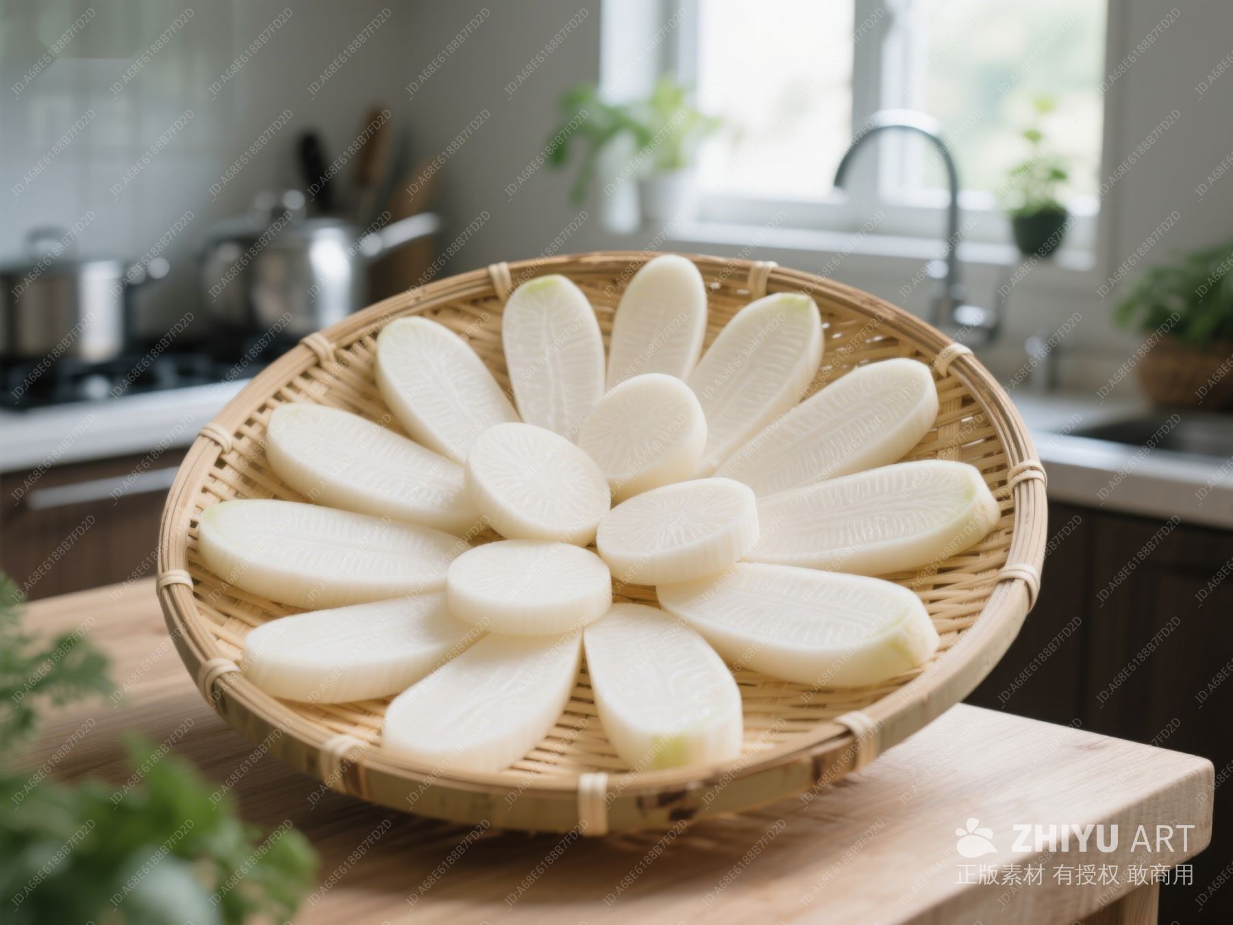 厨房竹篮上的白萝卜片 103