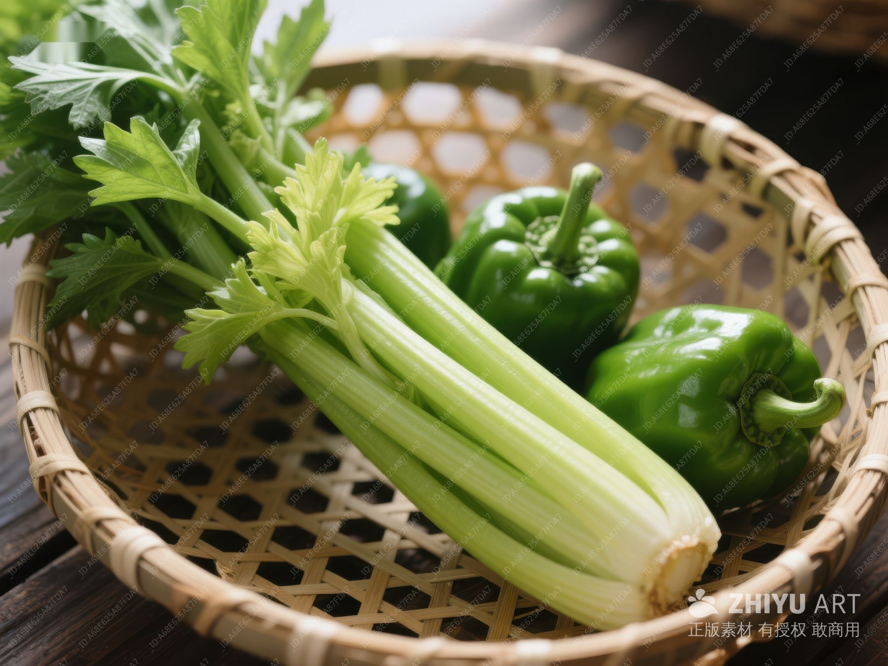 新鲜芹菜置于竹篮,配以木柄刀具 481