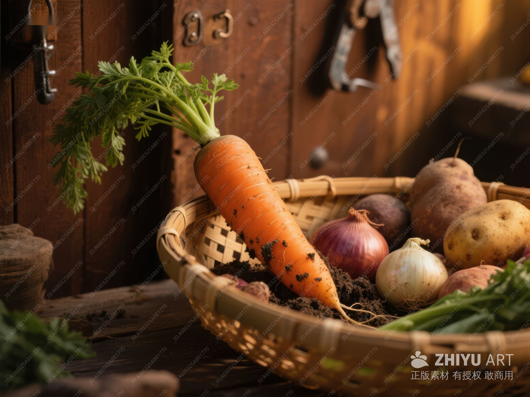 篮中胡萝卜与洋葱的静物组合 50