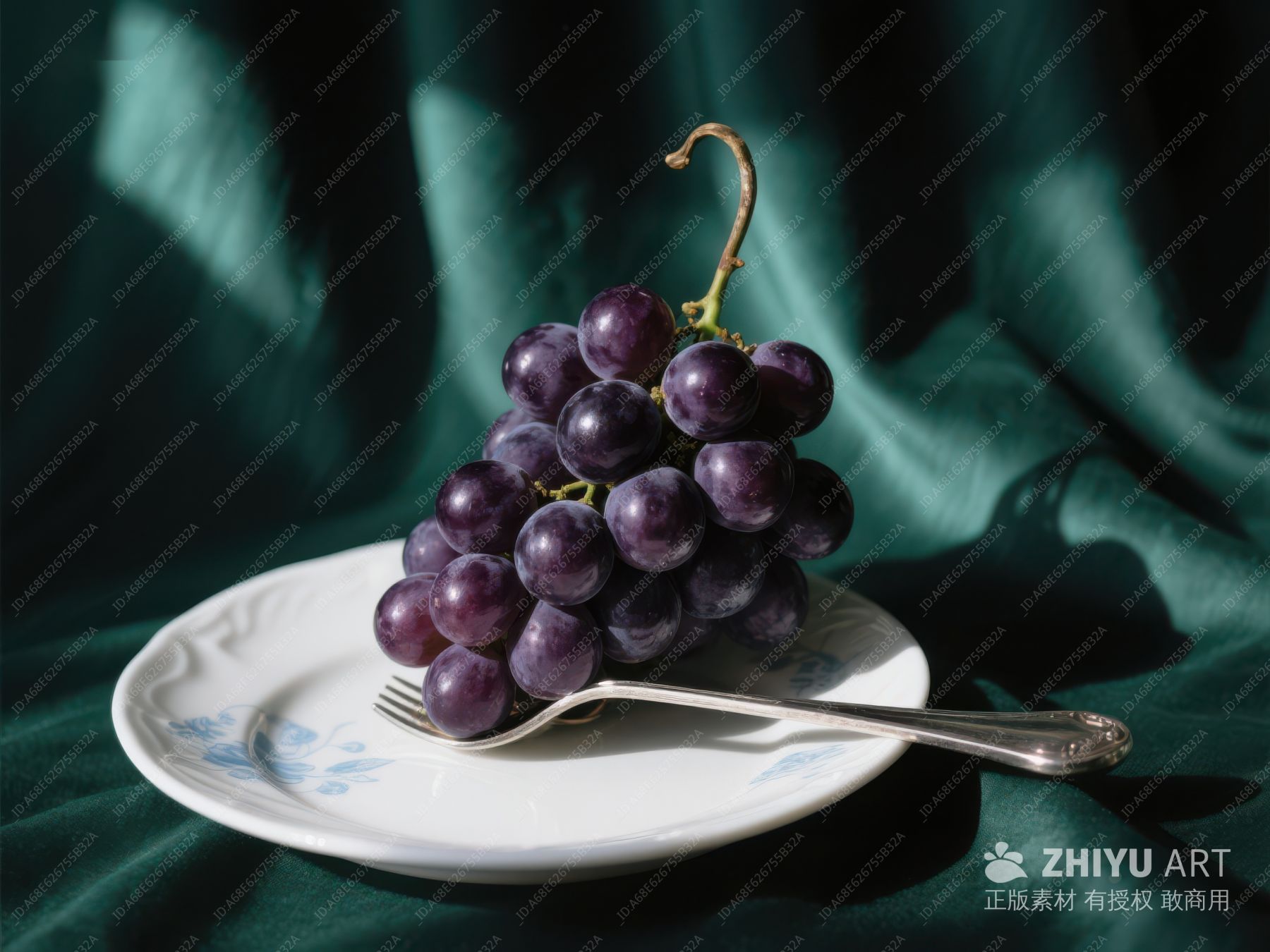 紫葡萄置于透明碟中,背景浅蓝布料 831