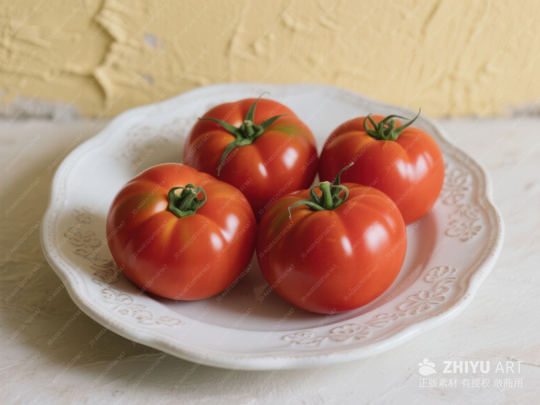 四个新鲜番茄置于白色盘中 365