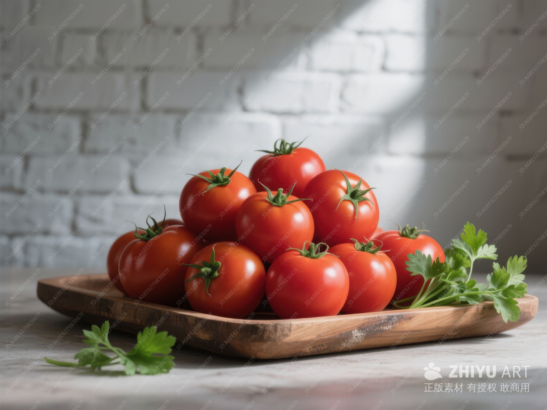 新鲜番茄置于木盘,背景为白砖墙 475