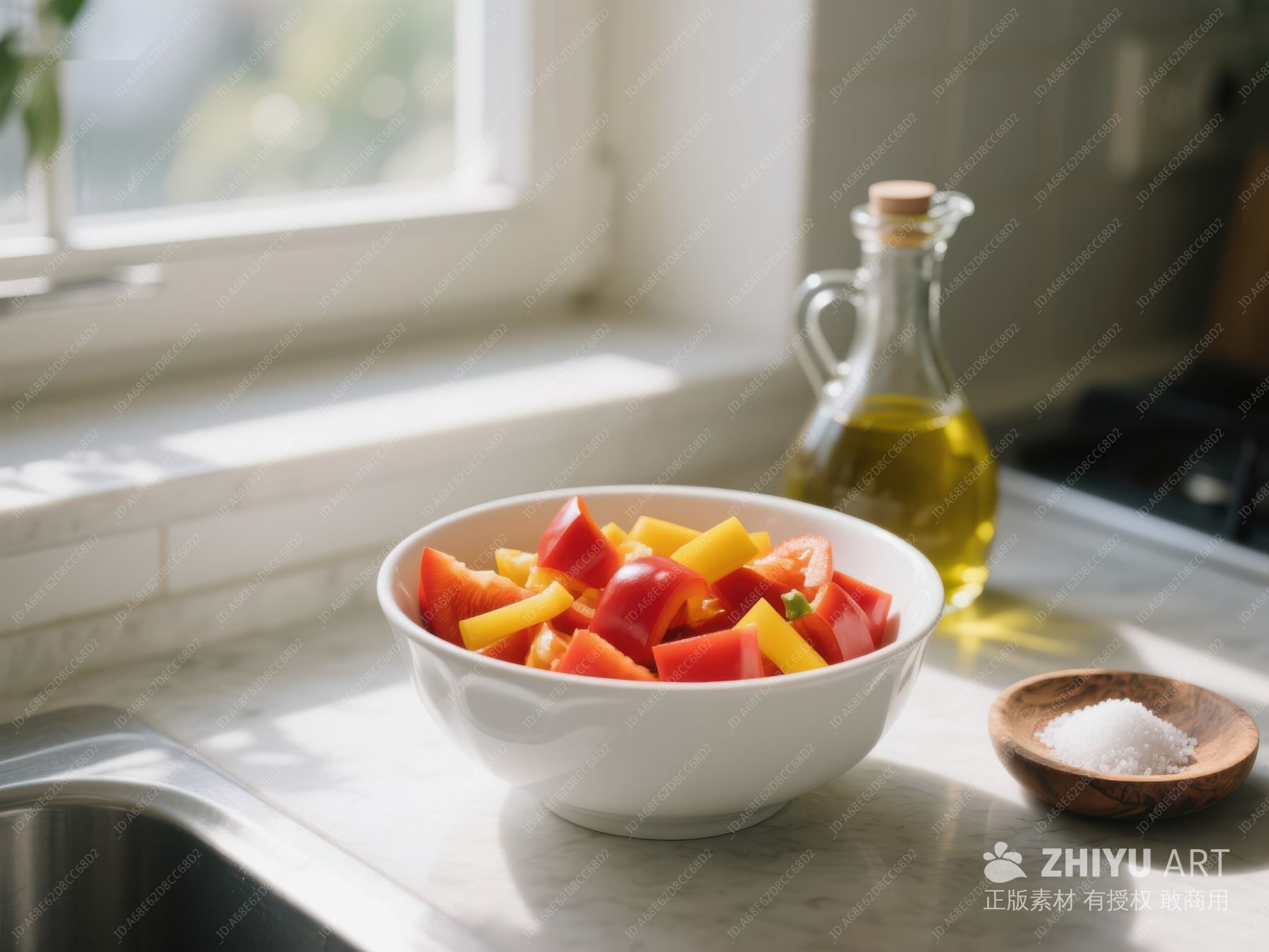 一个厨房场景,窗户旁边有各种蔬菜,包括红辣椒、番茄