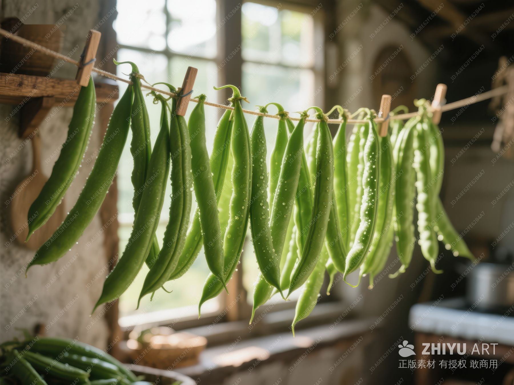 新鲜豆荚悬挂晾晒,篮中盛放 441