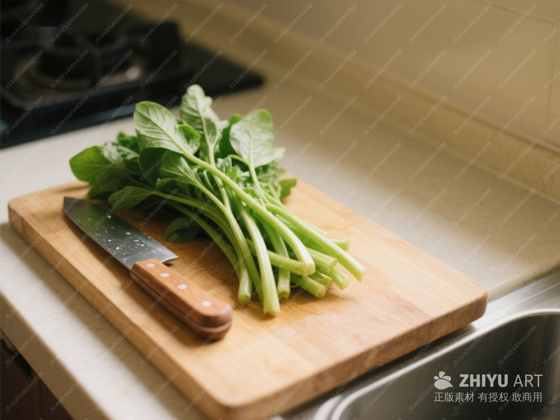 新鲜绿叶蔬菜与菜刀置于砧板上 478