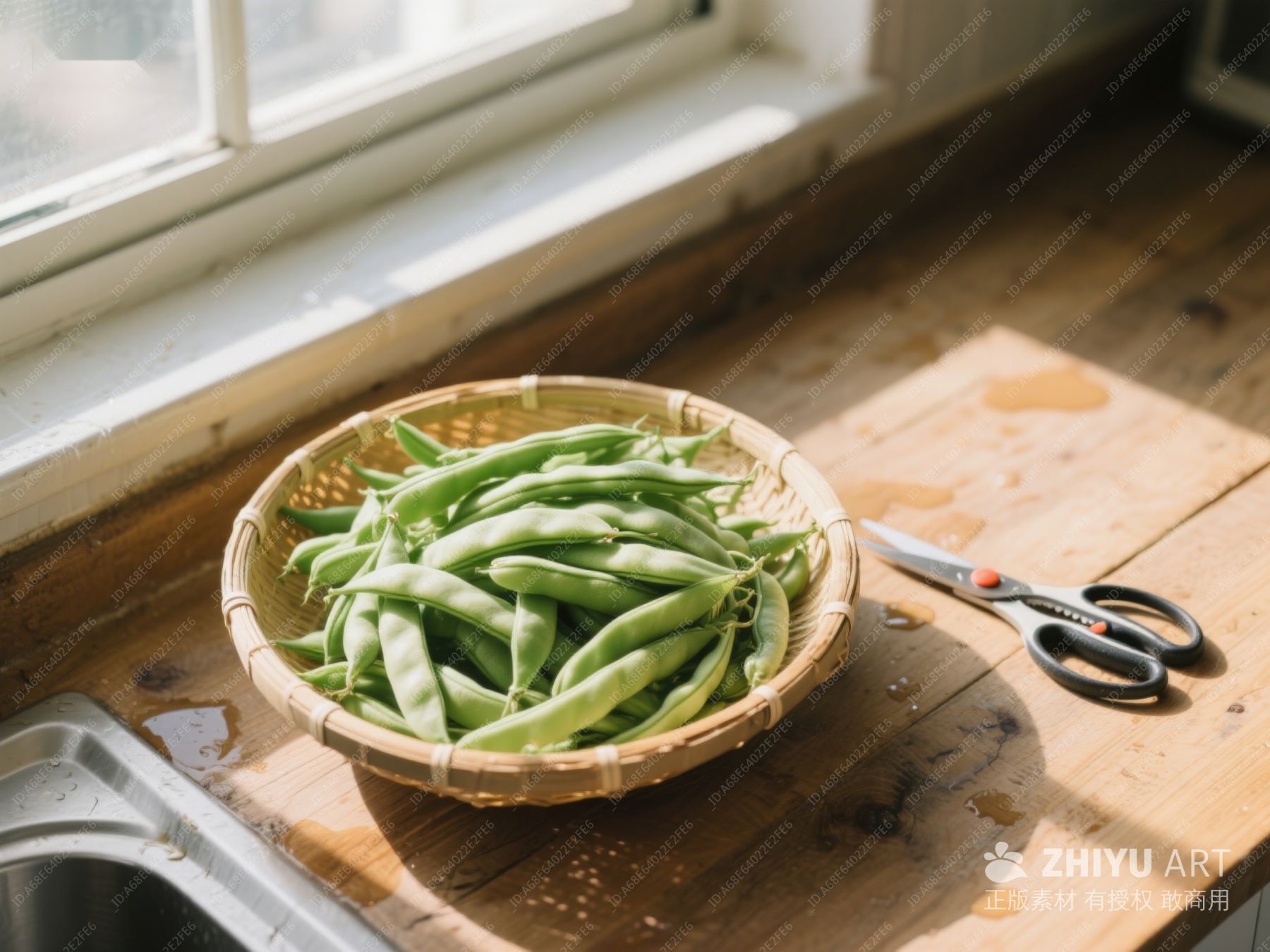 厨房桌上倾倒的篮子与新鲜豌豆 143