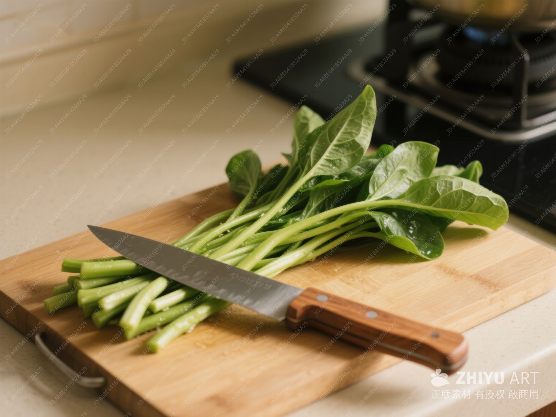 新鲜绿叶蔬菜与刀具置于砧板上 479