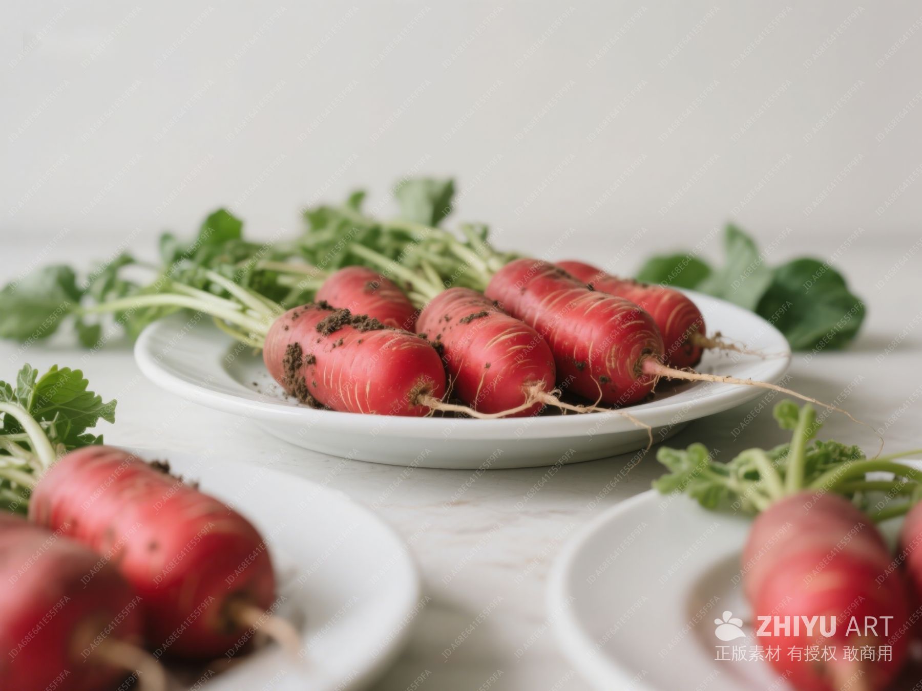 新鲜胡萝卜整齐摆放在白色盘中 424