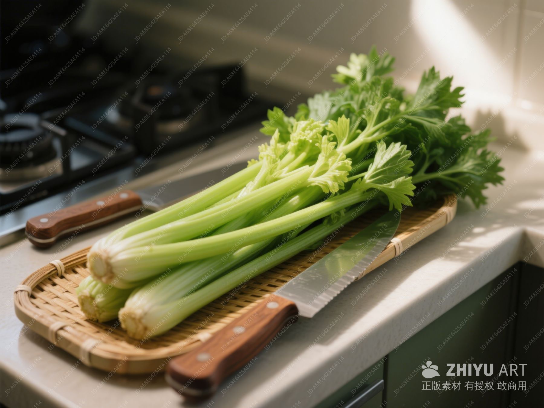 新鲜芹菜与木柄刀置于竹编托盘 498