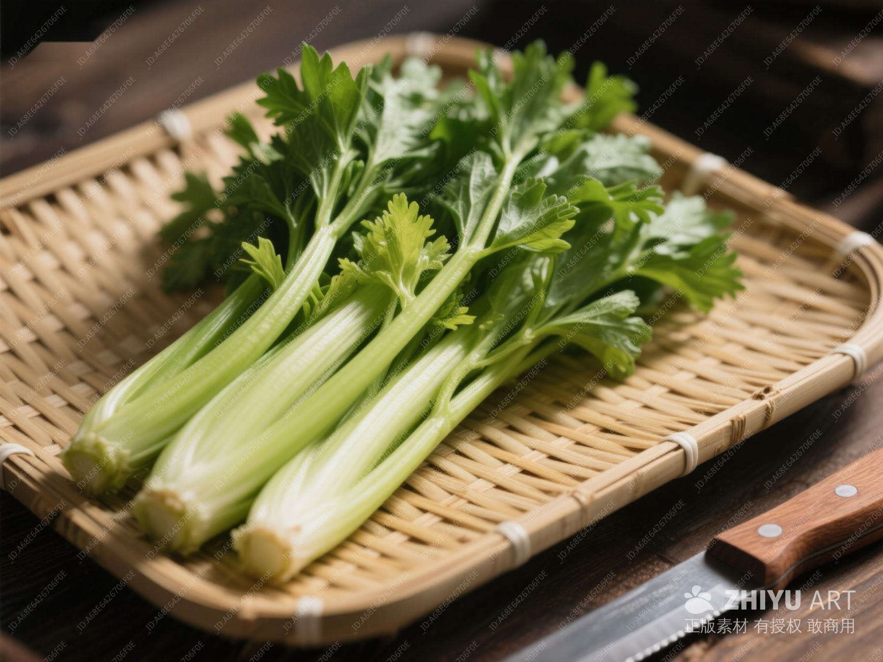 新鲜芹菜置于竹篮,配以木柄刀具 481