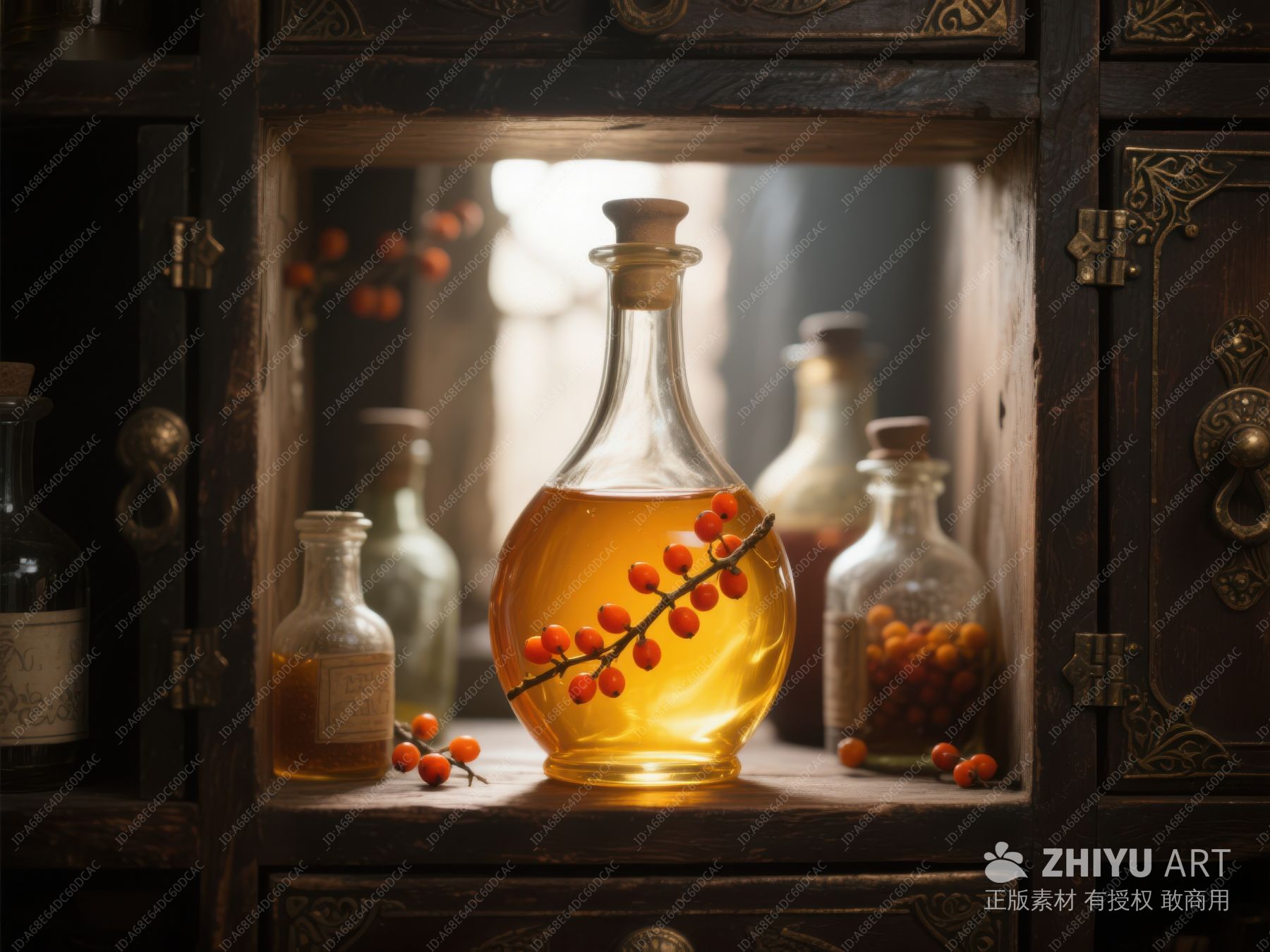 金黄色液体与浆果枝的静物组合 196