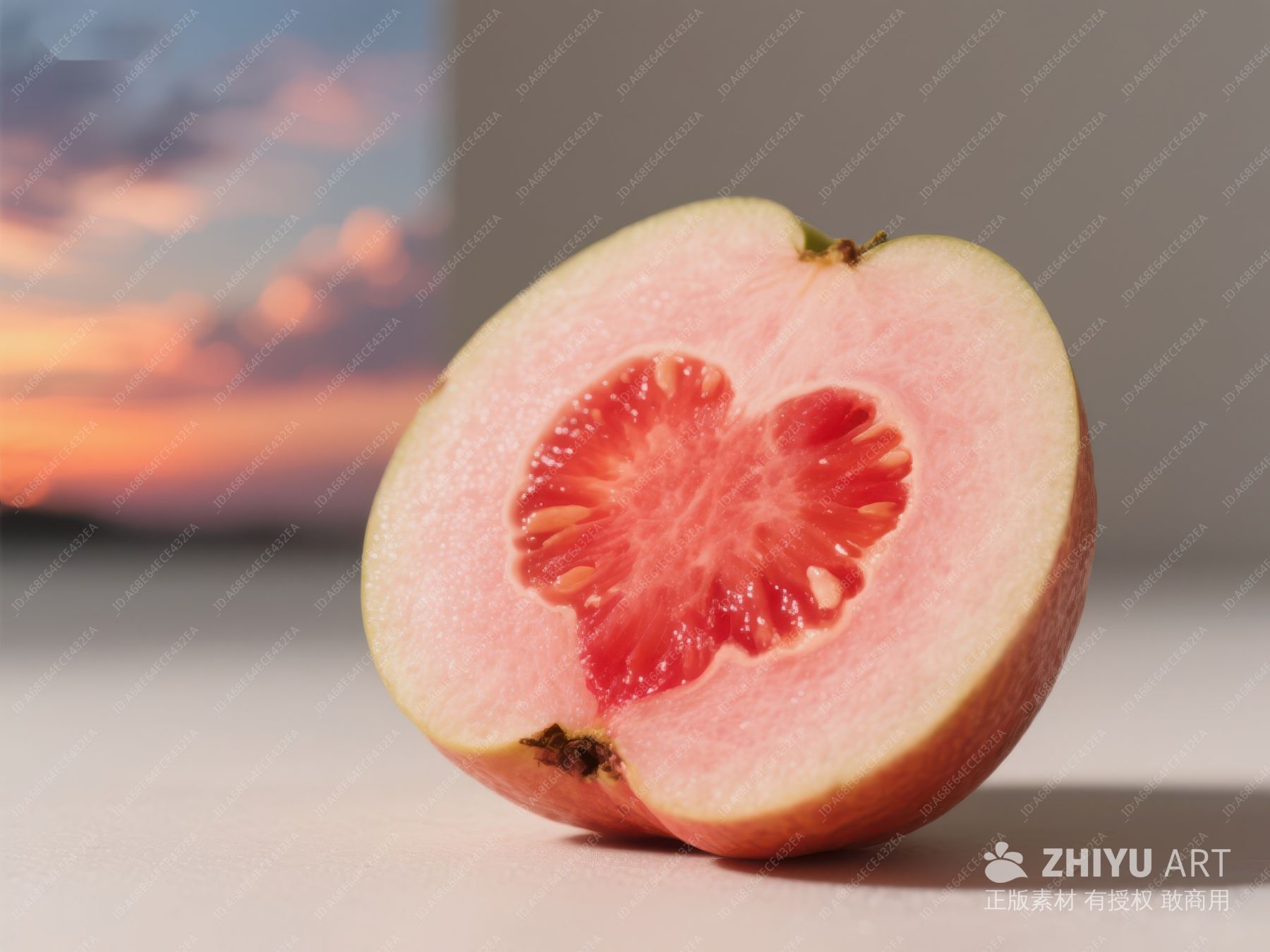 切开的番石榴,展示粉红色果肉和黑色种子 401