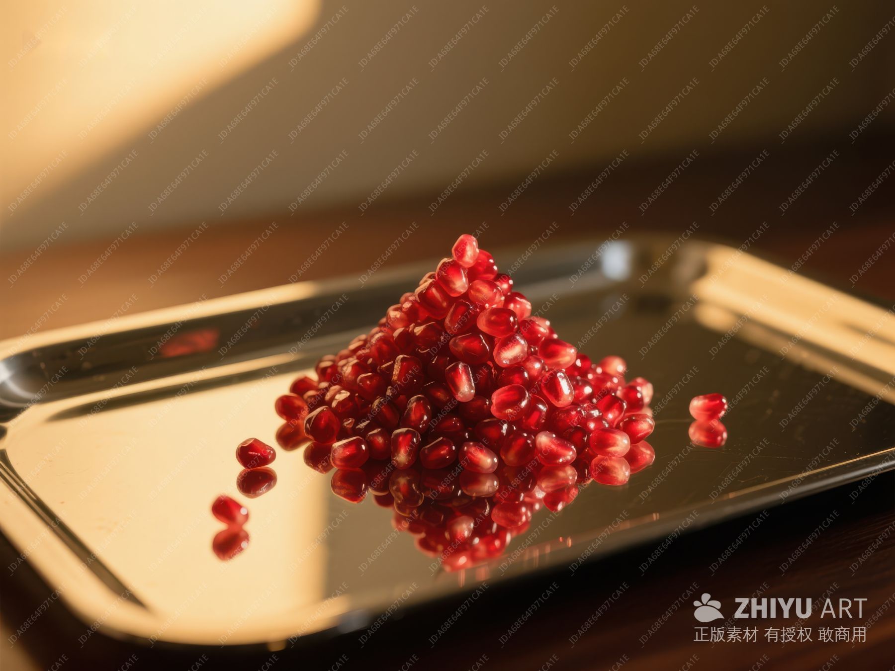 晶莹剔透的石榴籽堆放在金属盘中 198