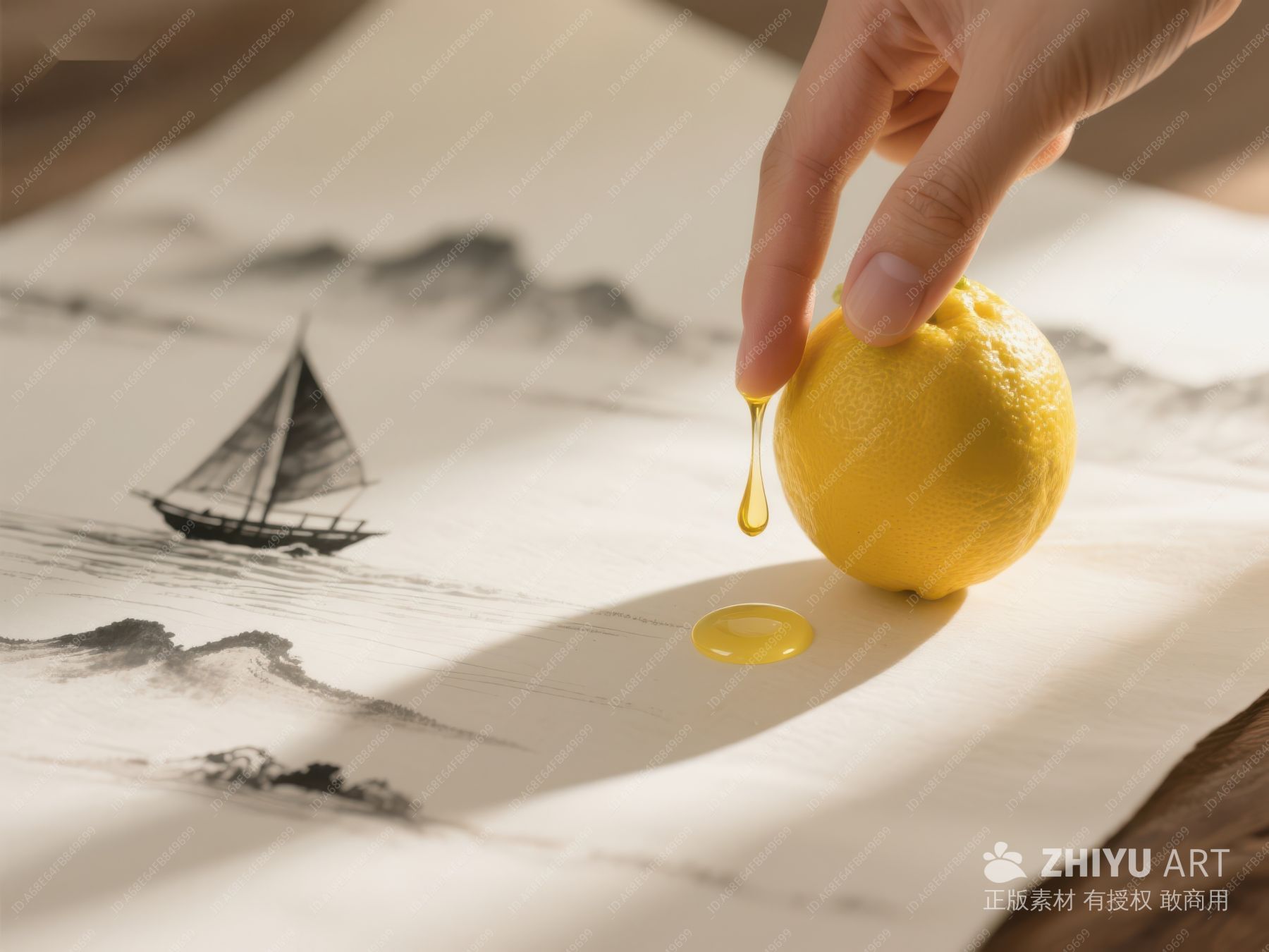 手挤柠檬,墨画山水背景 488