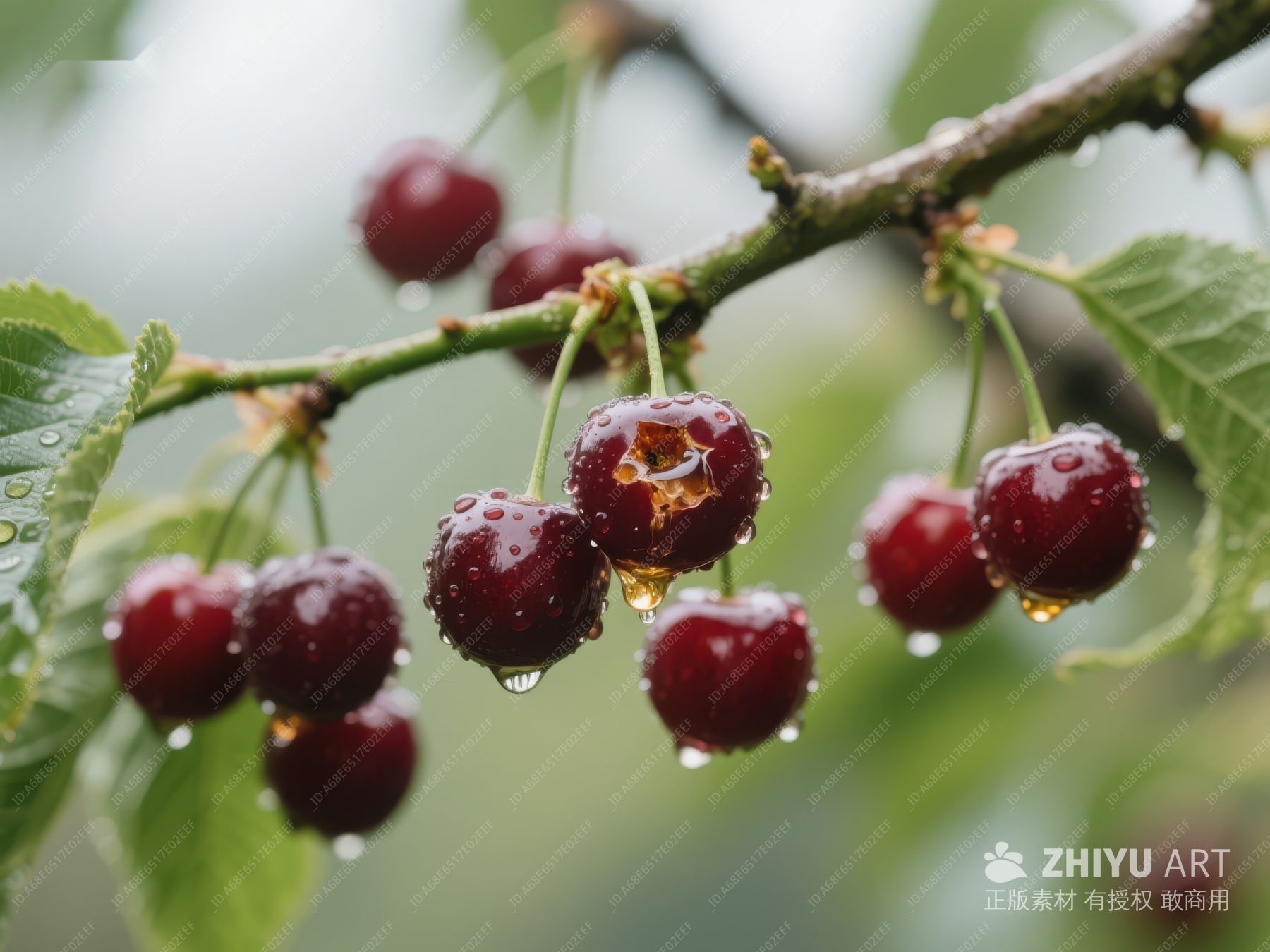 樱桃枝浸入水中,水珠晶莹剔透 822
