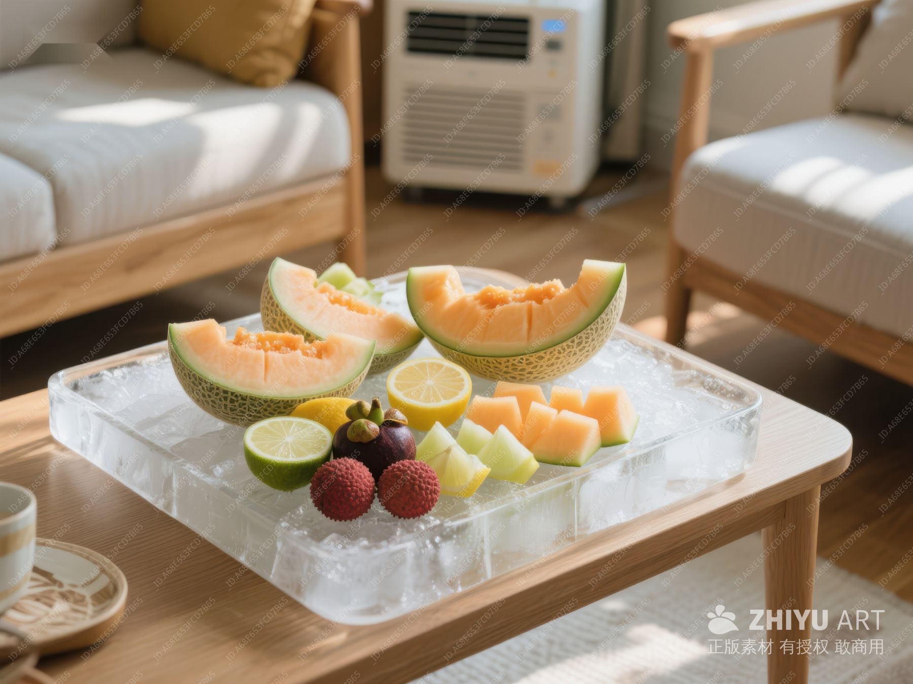 新鲜水果拼盘,冰块上冒着蒸汽 692