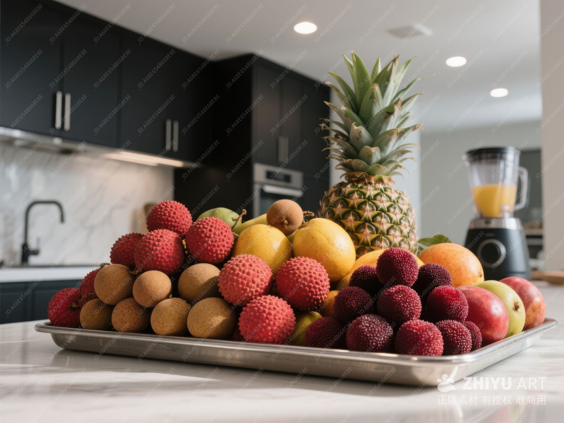 厨房台面摆放新鲜水果拼盘与果汁 184
