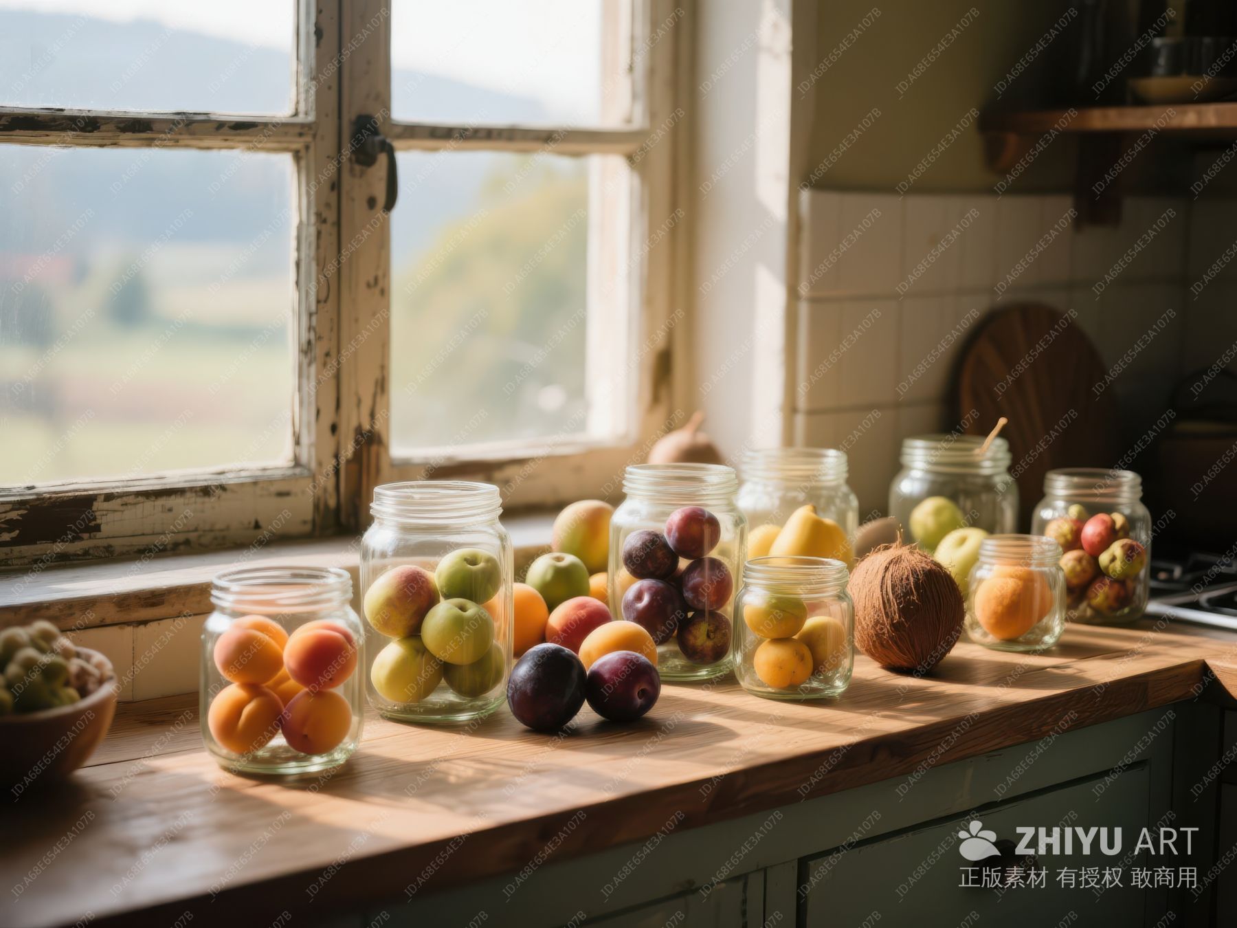 厨房窗台上的水果罐头与新鲜果蔬 140