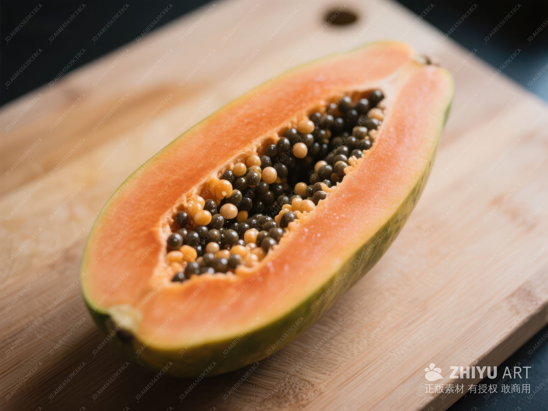 新鲜切开的木瓜,展示橙色果肉和黑色种子 713