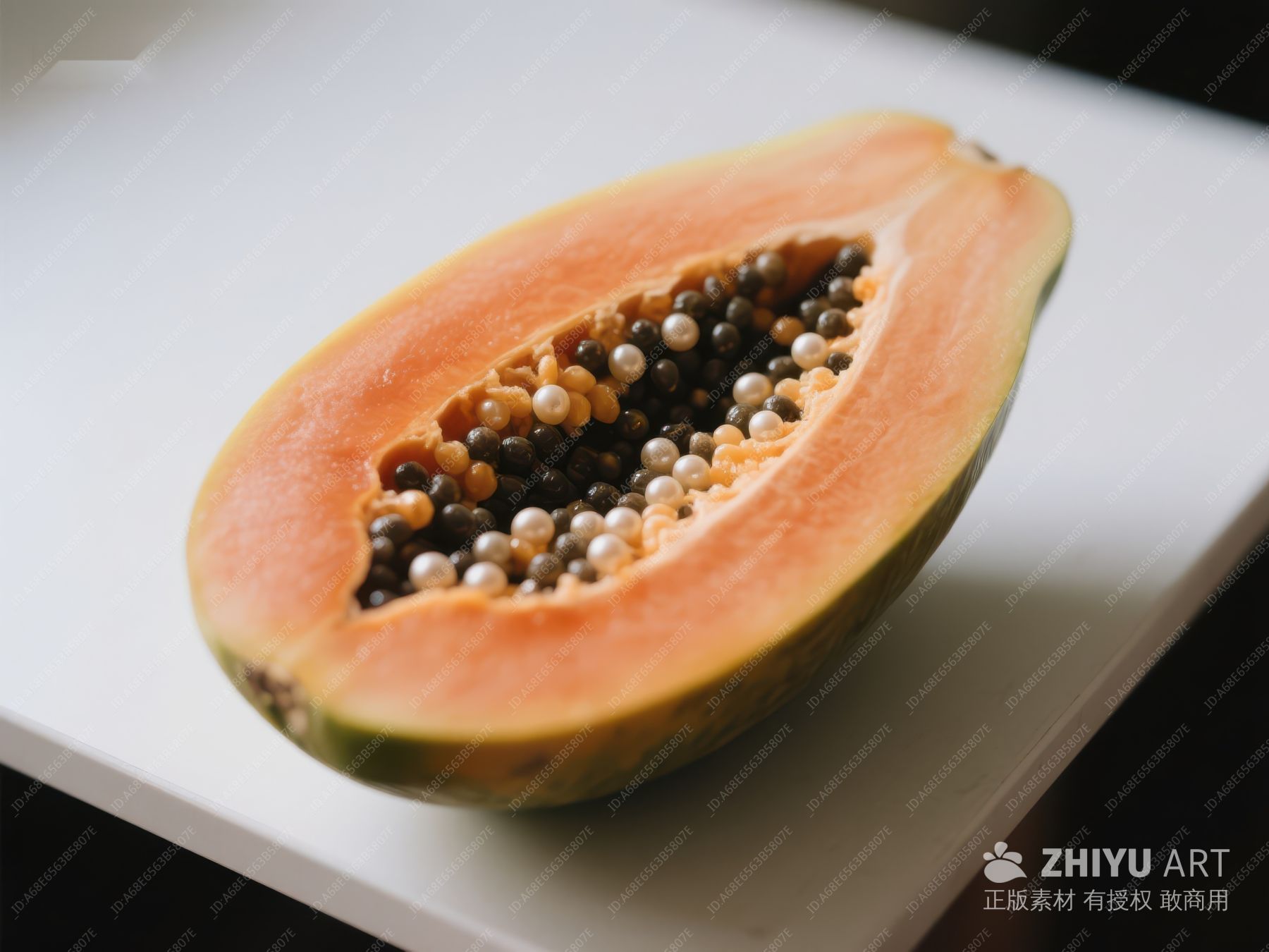 新鲜切开的木瓜,展示橙色果肉和黑色种子 713