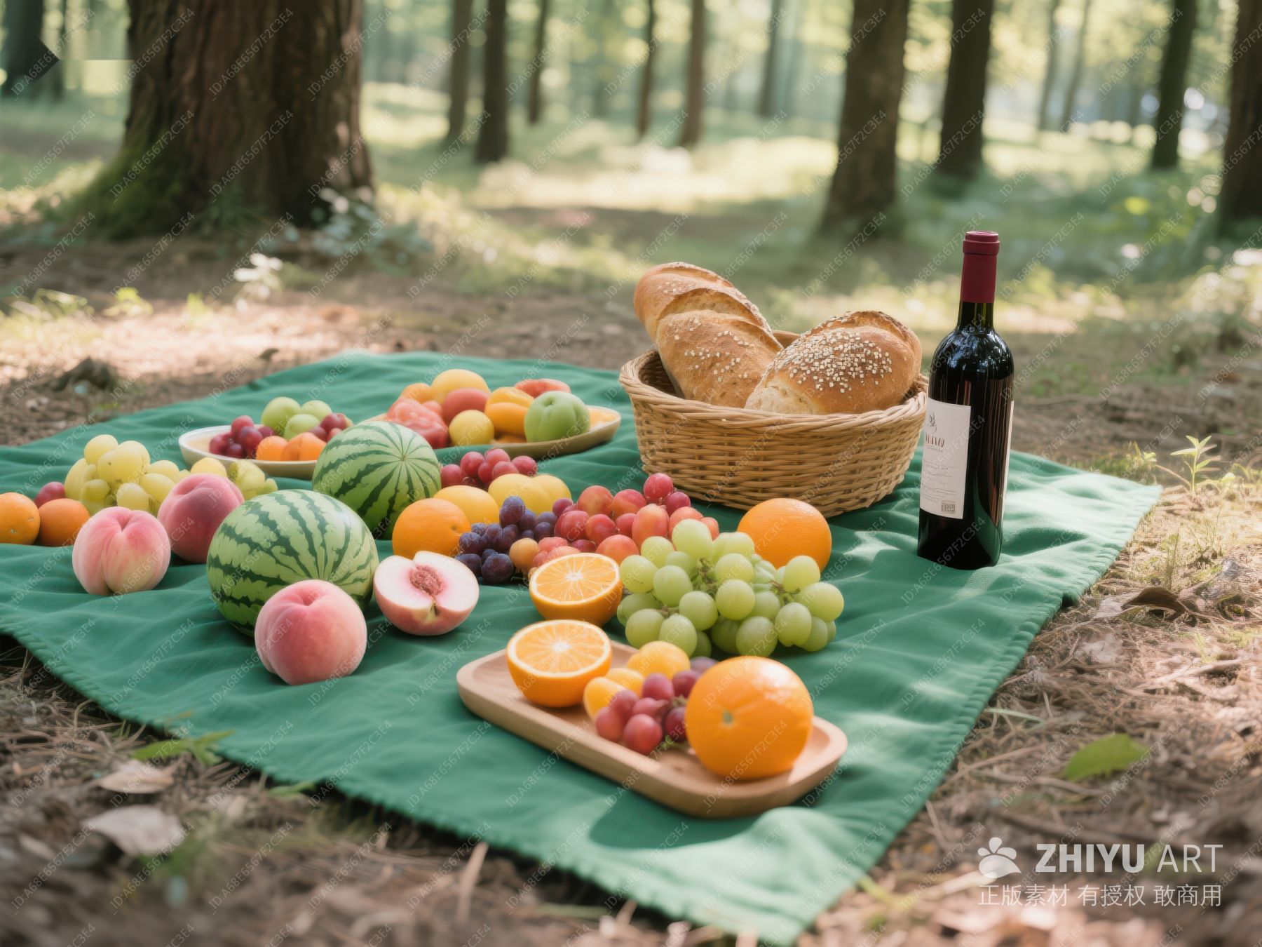 林间野餐:水果面包与红酒 369