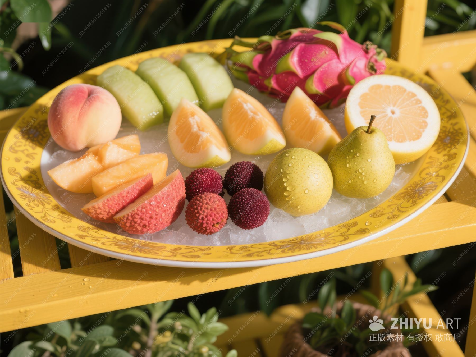新鲜水果拼盘,冰块上冒着蒸汽 692