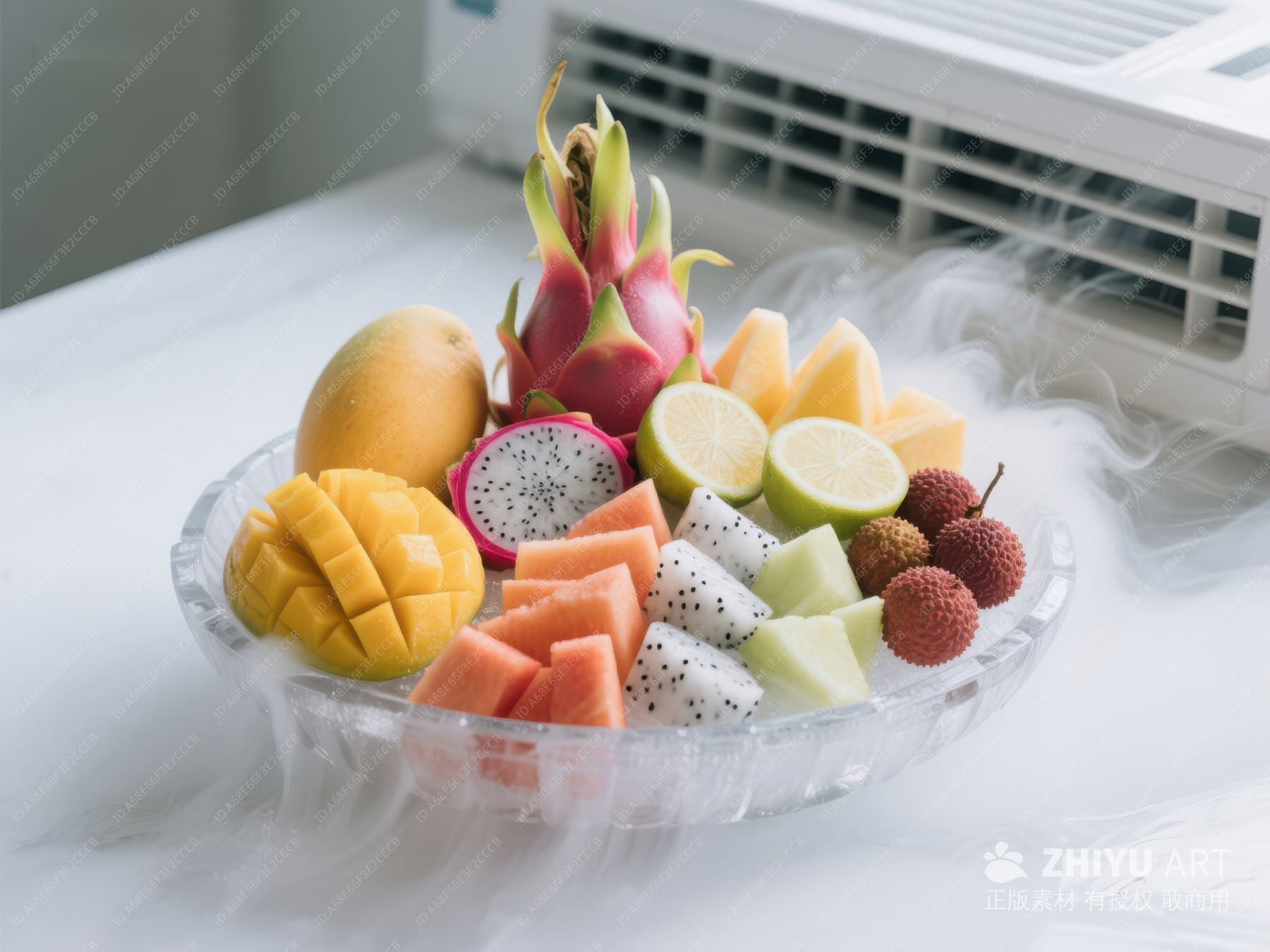 新鲜水果拼盘,冰块上冒着蒸汽 692