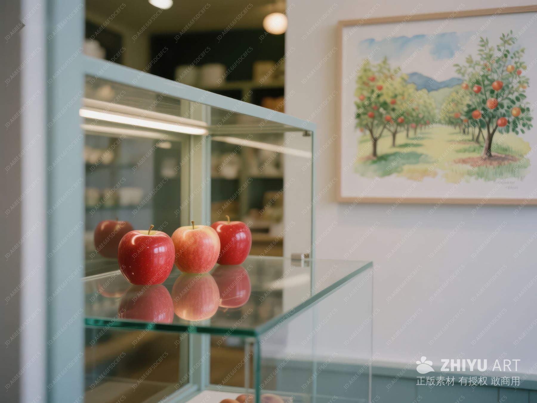 玻璃柜中苹果与果园画作 42