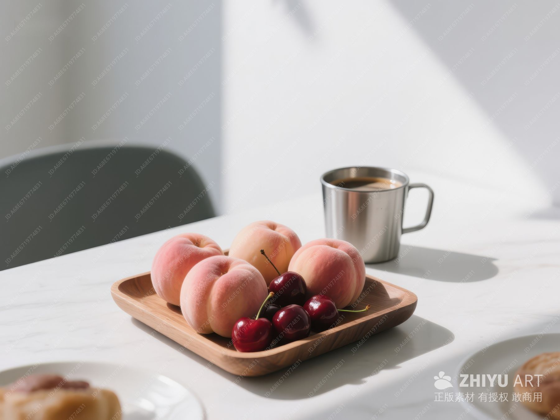 木盘上的桃子和樱桃配咖啡 420