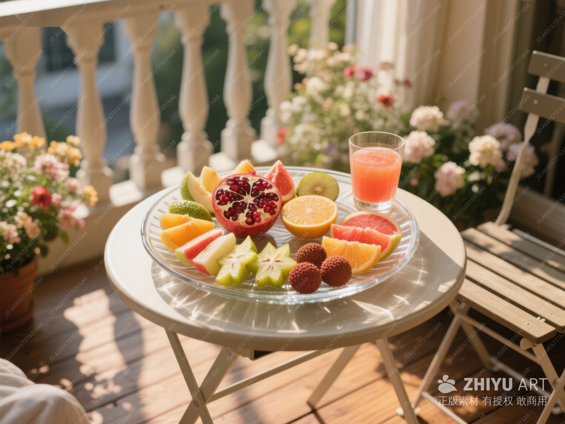 新鲜水果拼盘置于阳光下的白色桌布上 728