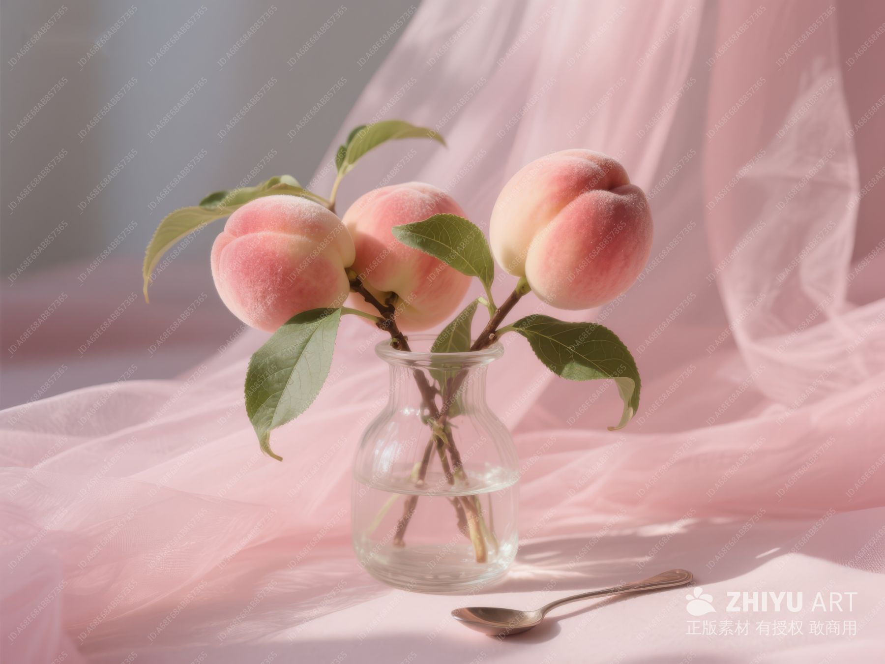 桃子陈列于玻璃架上,背景为粉色艺术画 559