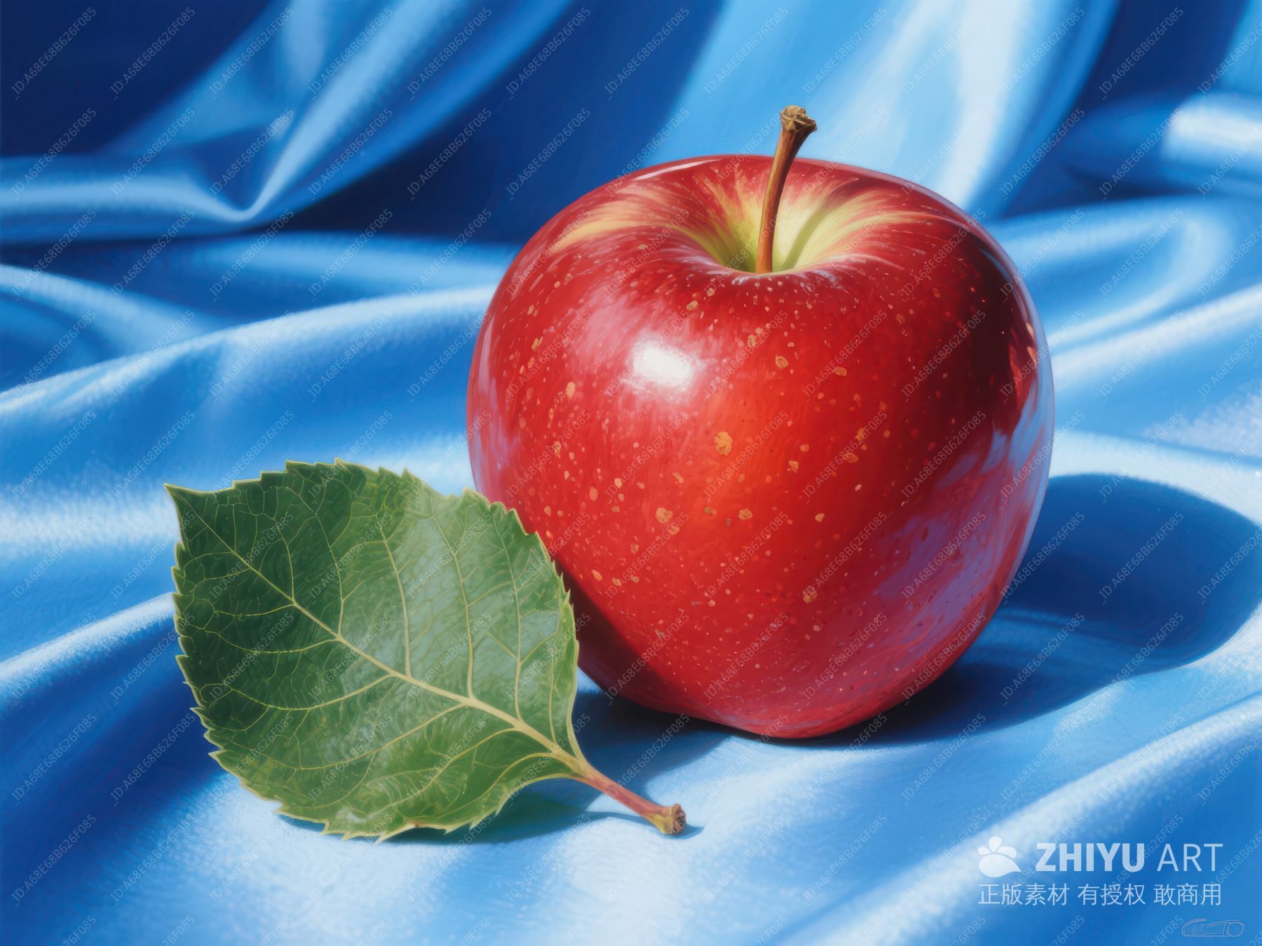 红苹果与绿叶置于蓝色布上 117