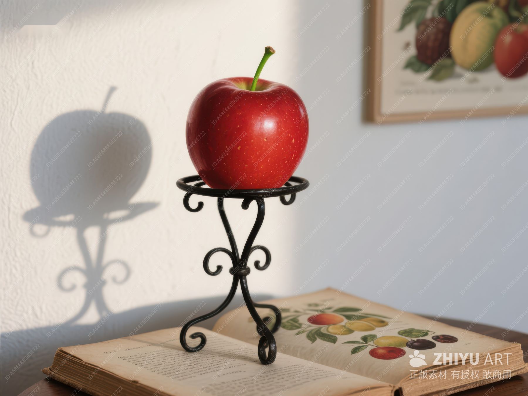 红苹果置于铁架上,背景为书籍与水果画 140