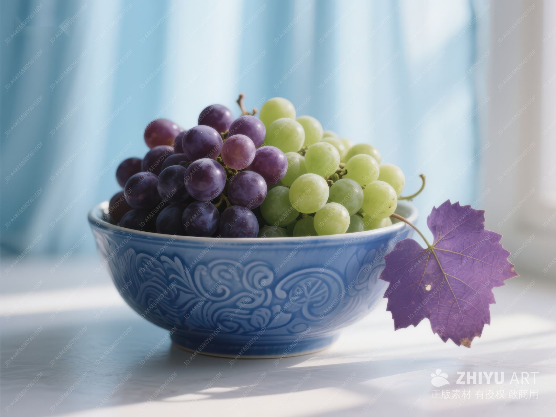 蓝碗中的紫绿葡萄与紫色叶子 195