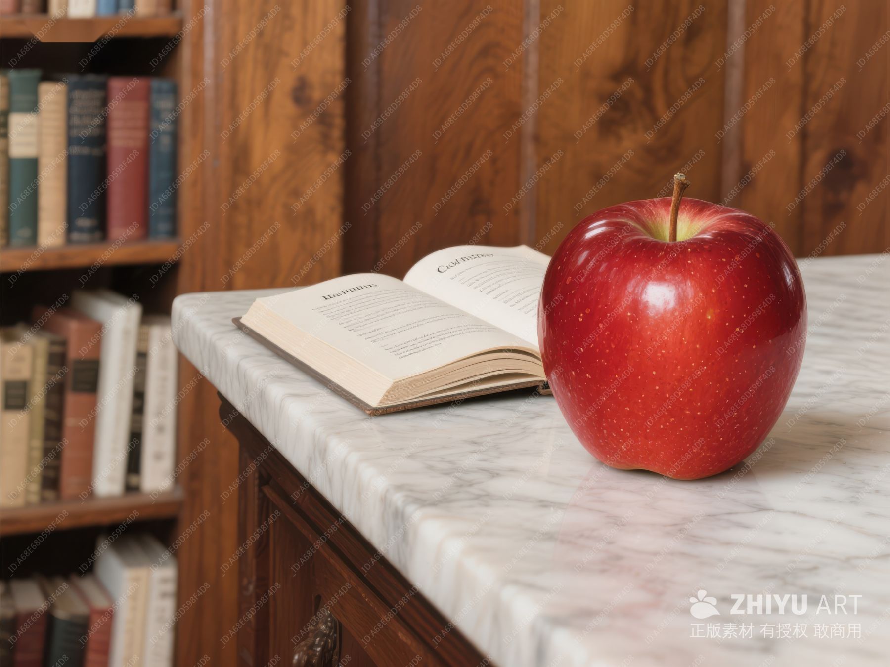 书桌上的红苹果与书籍 451