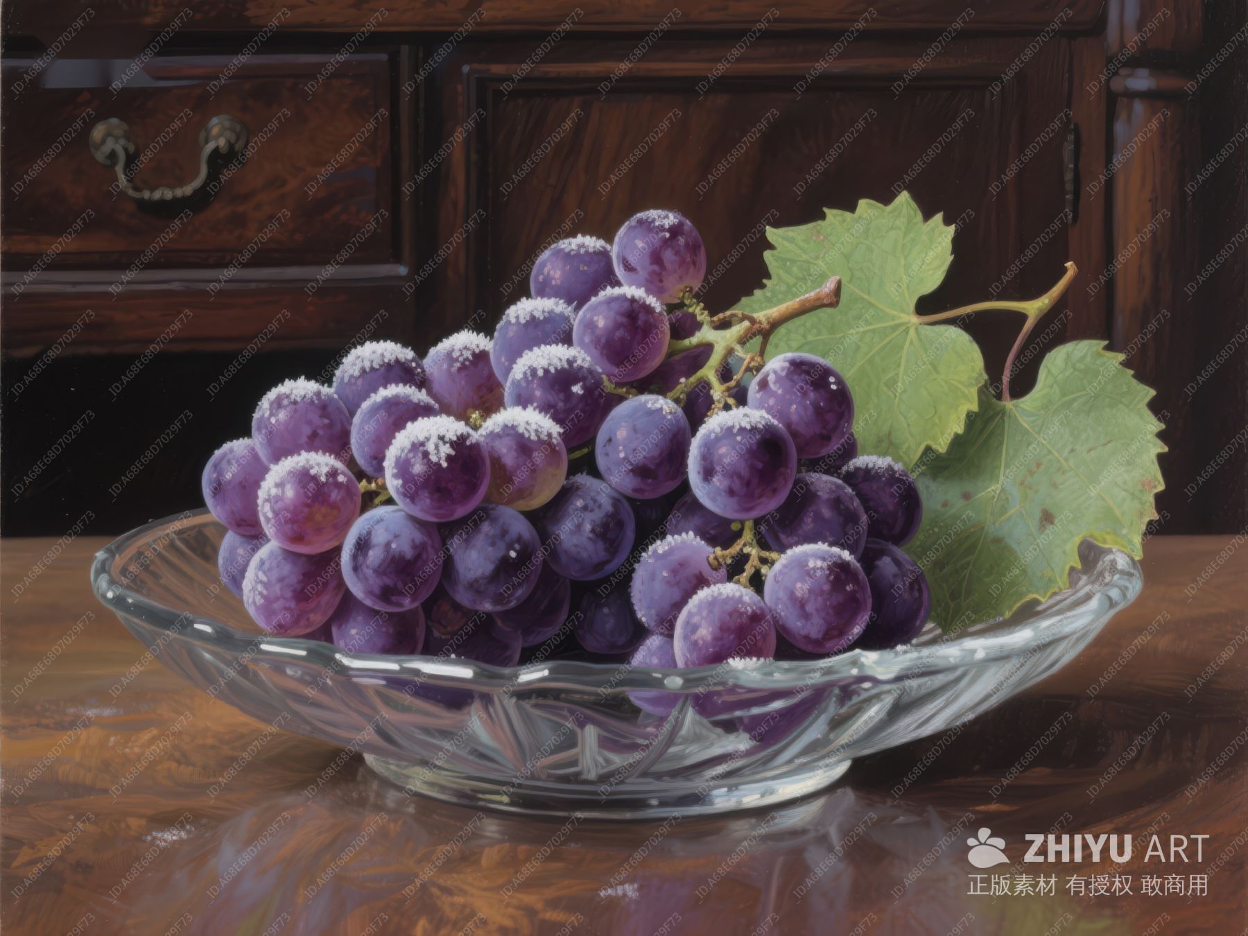 葡萄静物:透明碗中的紫葡萄与绿藤 291