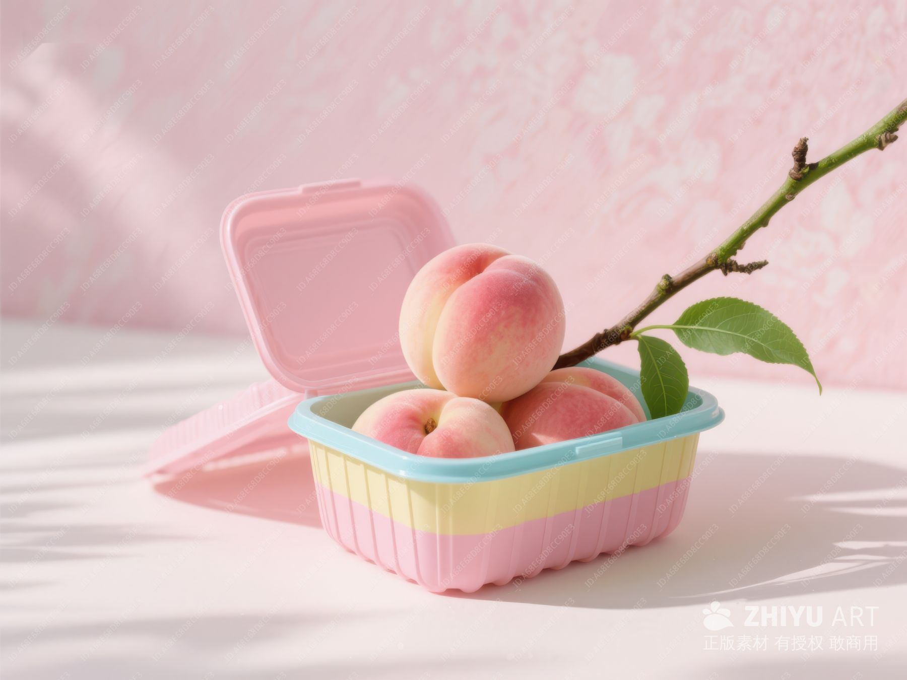 桃子陈列于玻璃架上,背景为粉色艺术画 559