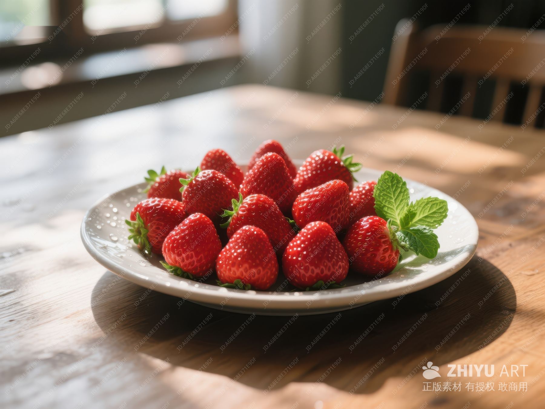 新鲜草莓配薄荷叶,阳光洒在木桌上 516