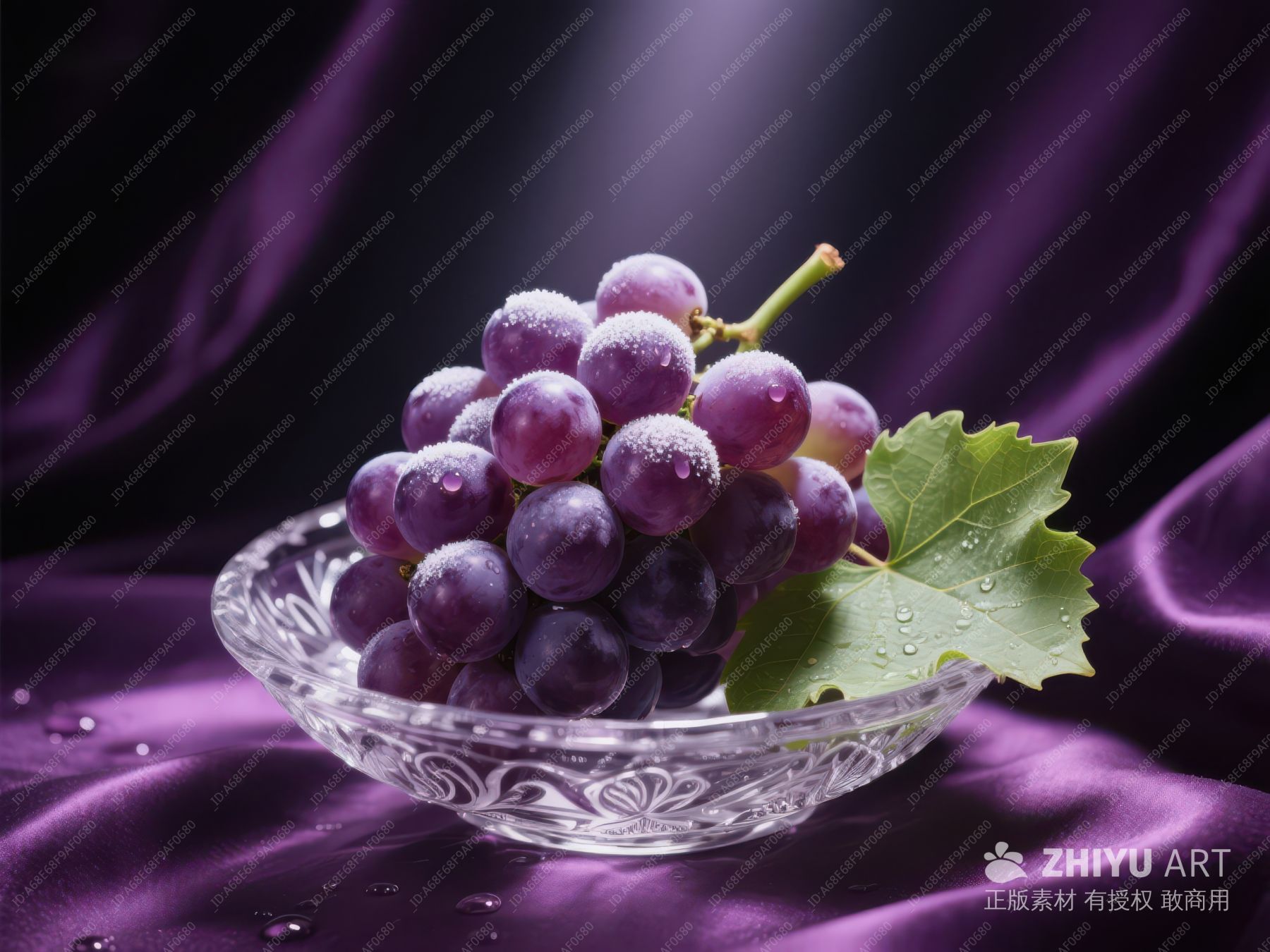 紫葡萄置于透明碗中,背景为紫色布料 833