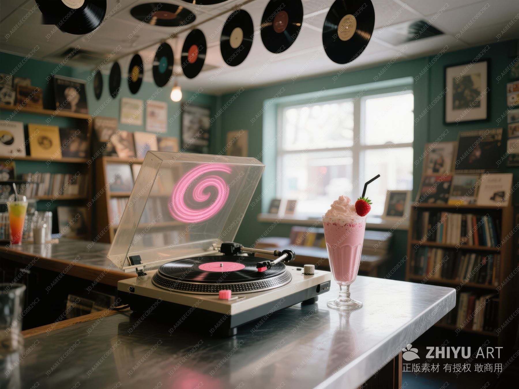 一个老式唱片机正在播放一张黑胶唱片,房间光线昏暗,