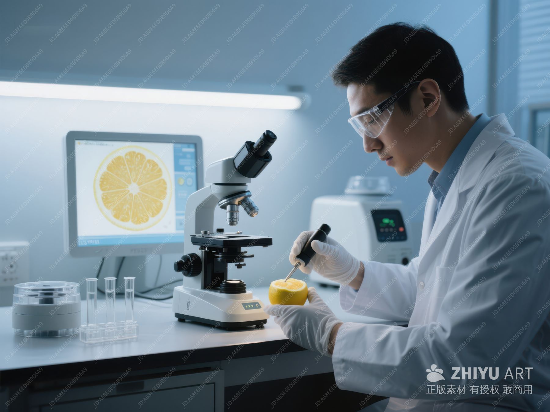 一位女性科学家穿着白色实验服和护目镜,正使用显微镜