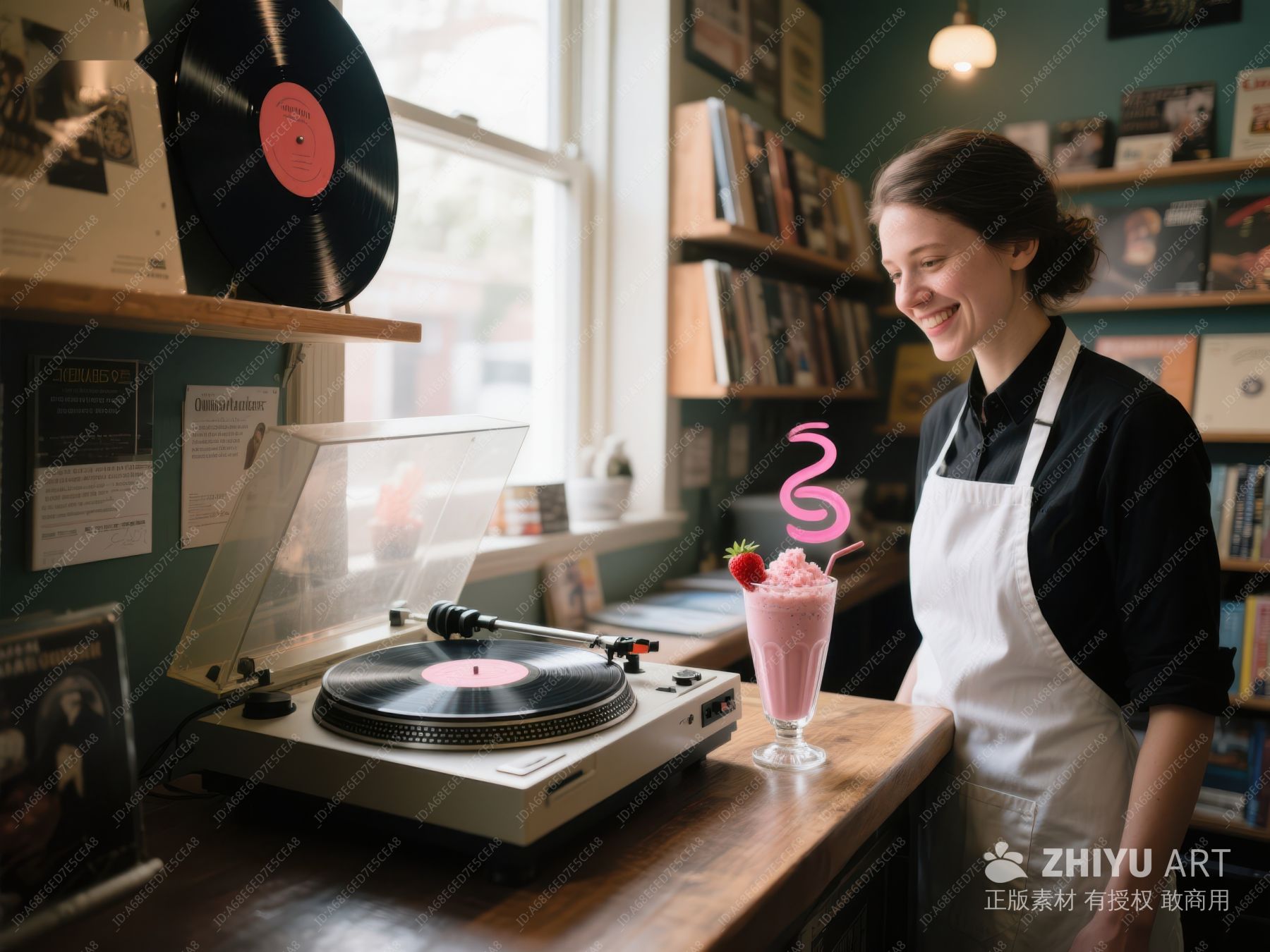 在夜晚的街头咖啡馆,一位有着棕色卷发的16岁女孩微