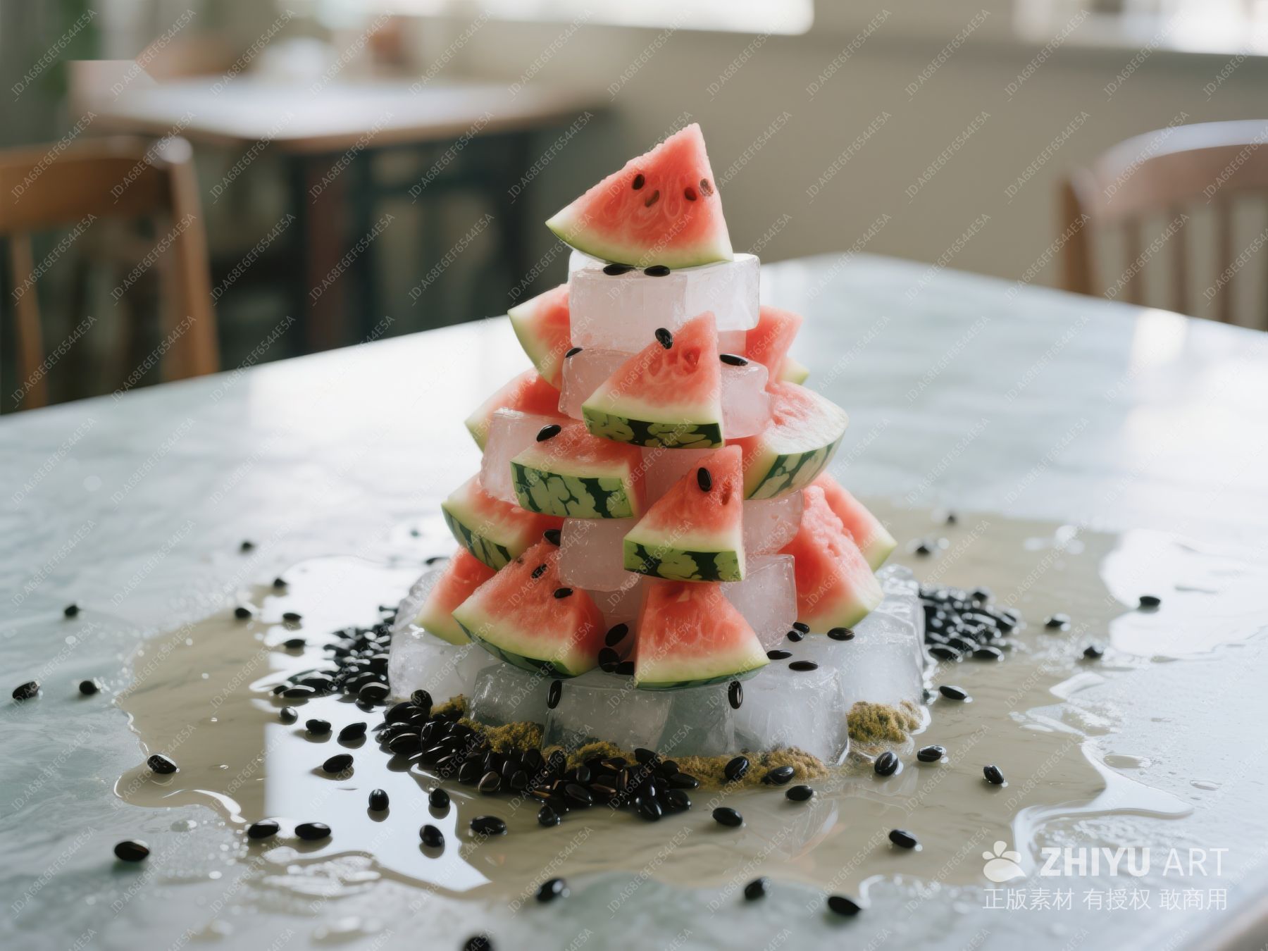 西瓜雕刻成玫瑰花,置于冰盘中 1211