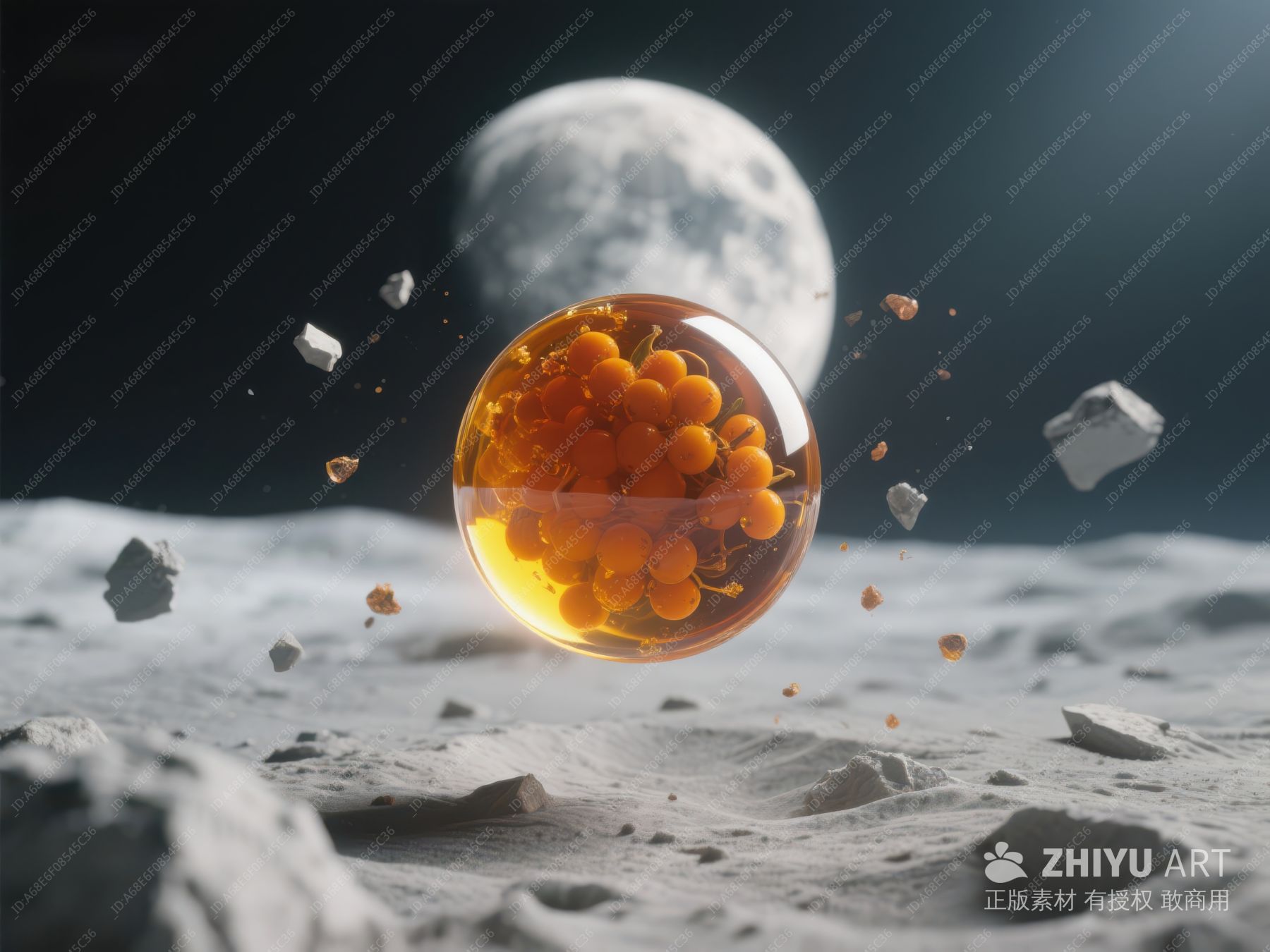 一个贫瘠、荒芜的月球表面,在如同砗磲般发光的空间站