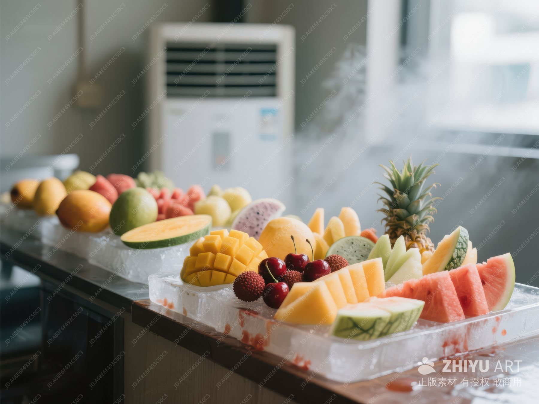 新鲜水果拼盘,冰块上冒着蒸汽 692