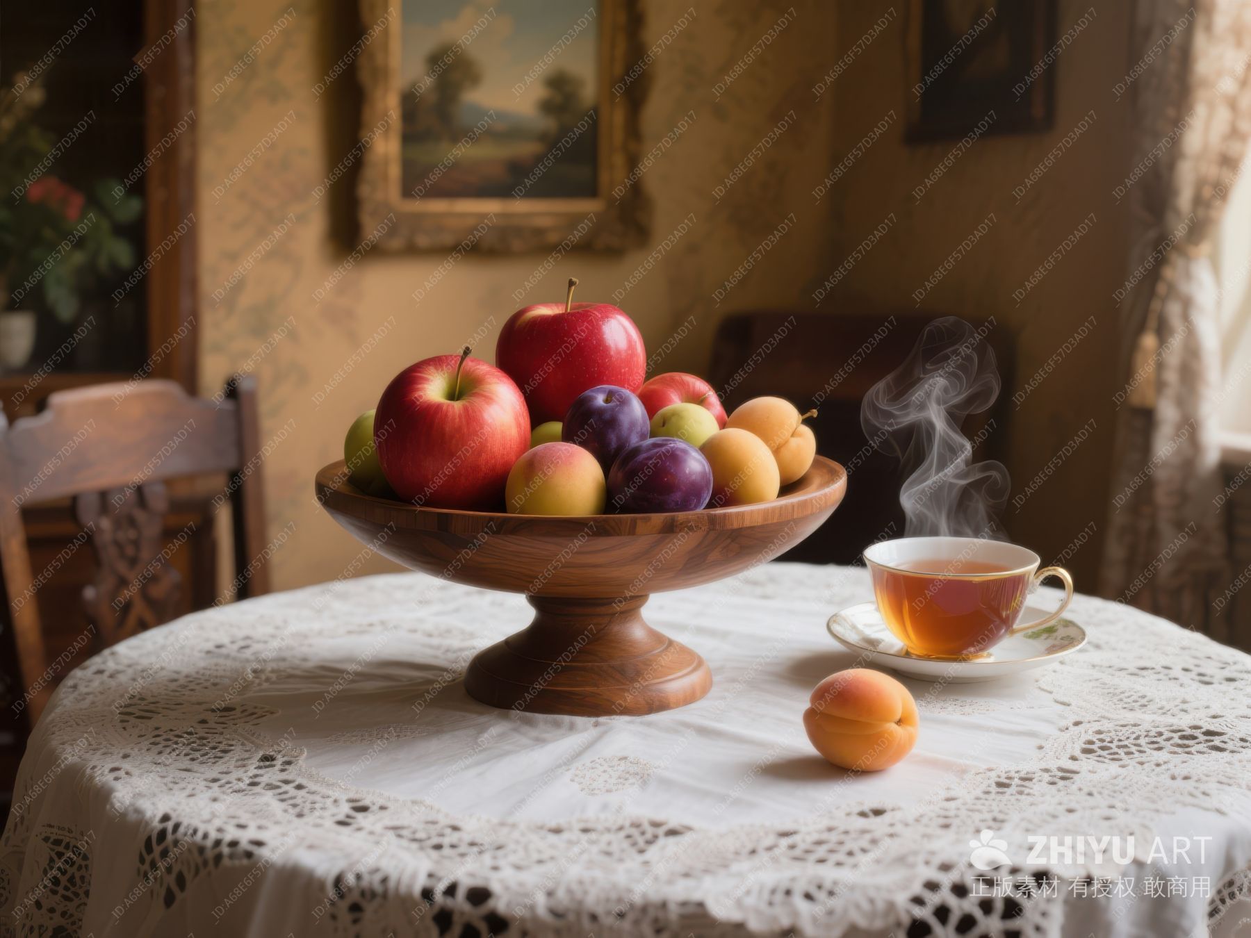 木桌上的水果盘与热茶 400